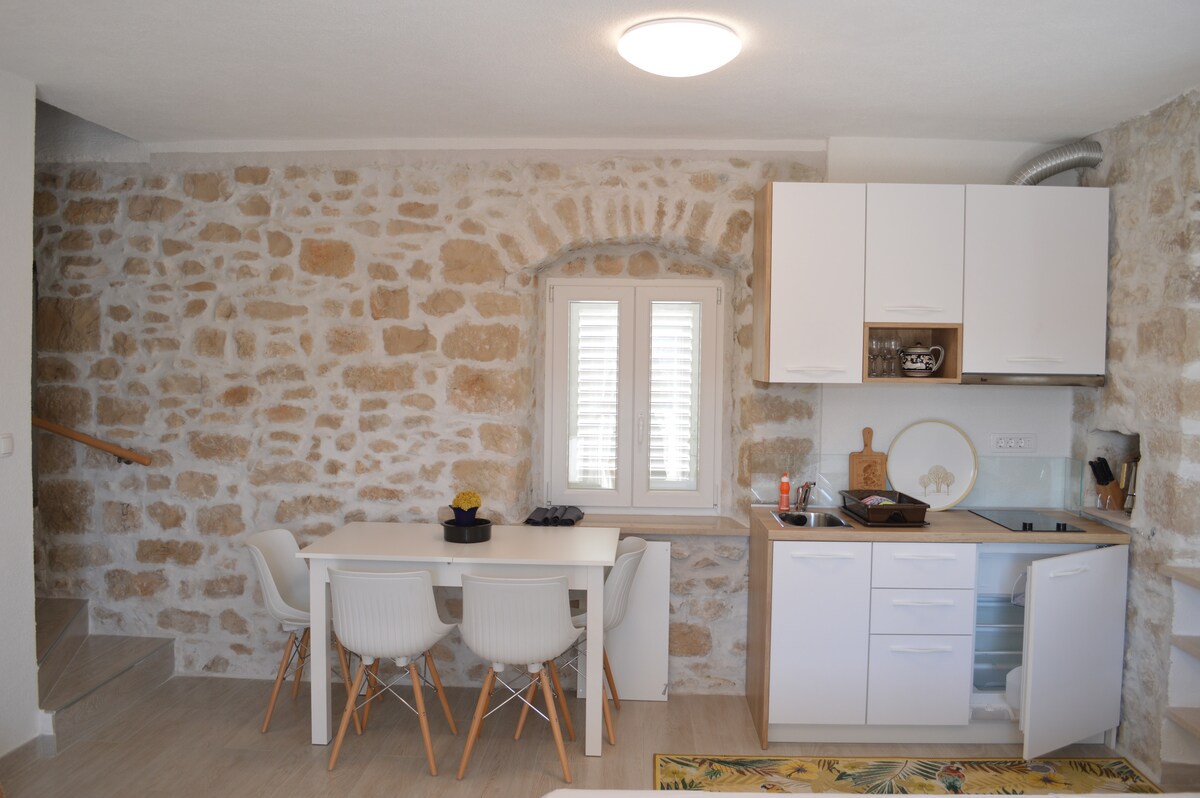 Каменная красота 1467 года, памятник культуры, расположенный в историческом ядре Пучишчи - одного из 15 самых красивых небольших городов Европы. Отреставрированный средневековый замок подарит вам моменты тишины и покоя, потому что передняя часть замка обращена к морю и городу, а за ним - сад, двор и три террасы для моментов отдыха. Квартира на первом этаже состоит из столовой и гостиной, кухни, ванной и спальни с видом на сад.