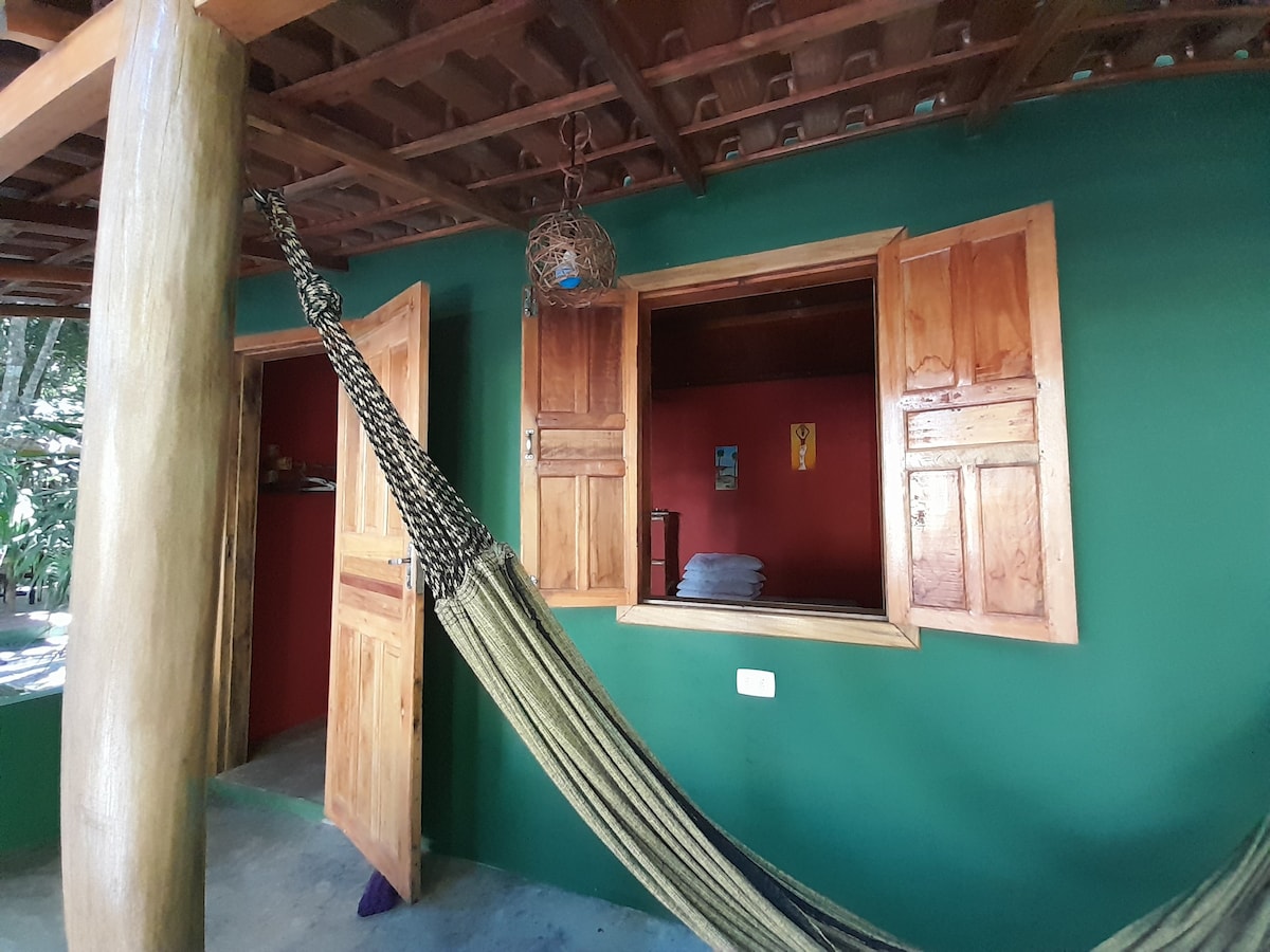 Уютное убежище для тех, кто любит спокойствие и природу. Наше шале площадью 24 м² и собственный балкон с видом на лес. В помещении у нас есть 1 двуспальная кровать размера King size, мезонин с 2 односпальными матрасами, ванная комната с электрическим душем и отдельный туалет. Кухня находится на открытом воздухе с видом на лес. В каждом шале есть открытая зона и пространство с гамаками для отдыха. Мы находимся всего в 2 км от ближайшего доступа к красивому пляжу и в 8 км от Понта-де-Корумбау.