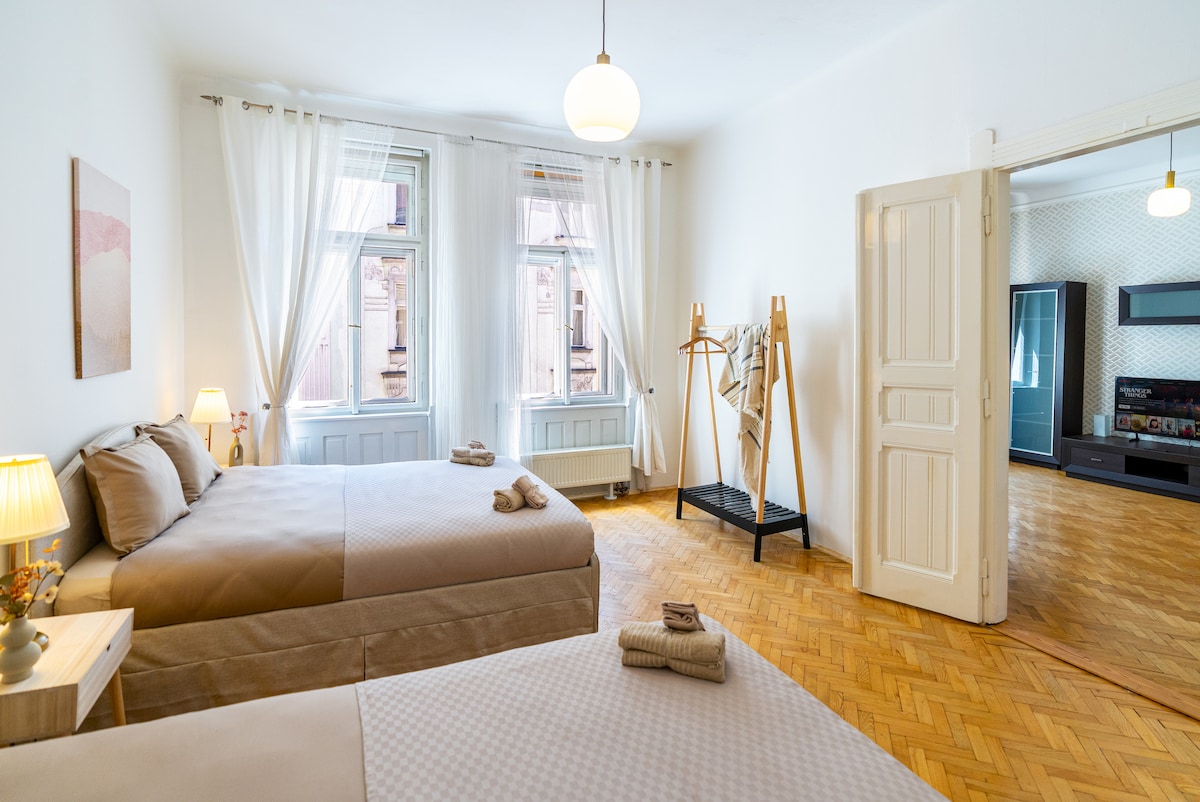 Недавно отремонтированная просторная квартира сочетает в себе элементы современного гламура и дизайна интерьера в стиле модерн XIX века. В том числе деревянные паркеты в замке XIX века и мраморная ванная комната с подогревом пола. Она расположена в центре Праги в 1 шаге от Вацлавской площади, Национального музея и главного (железнодорожного) вокзала.