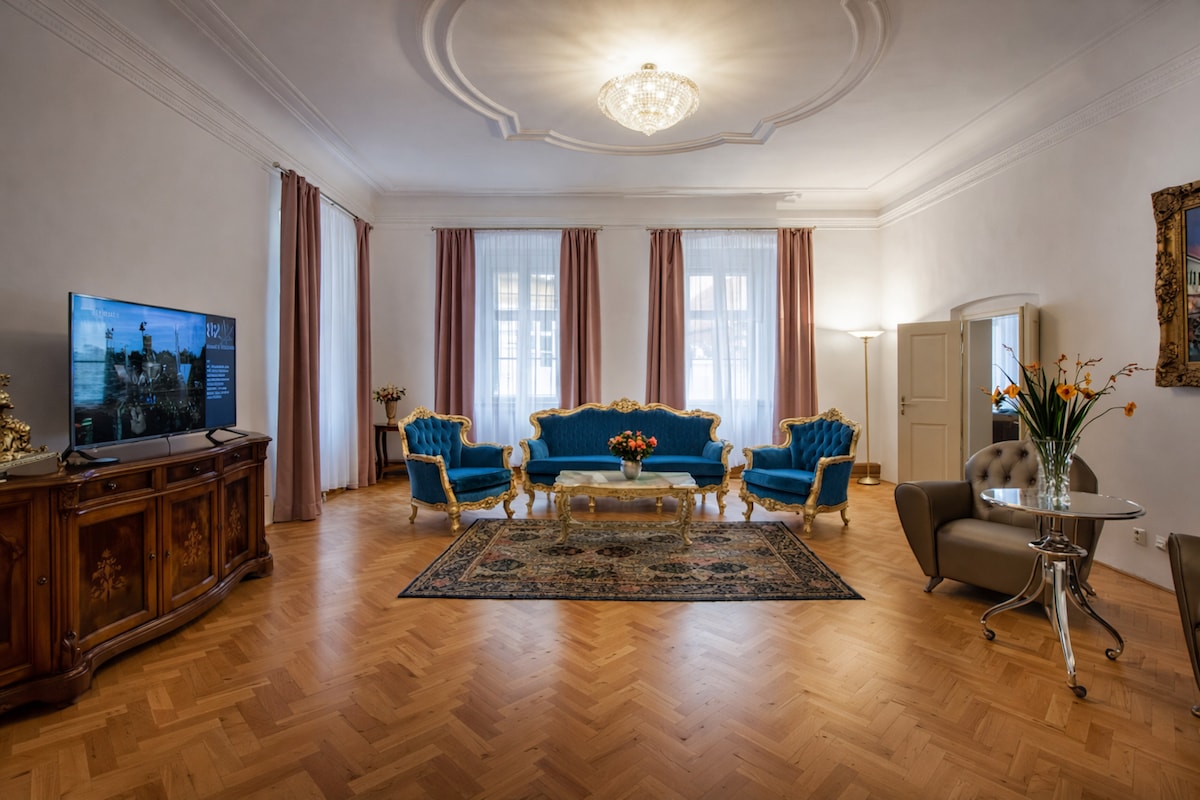 Расслабьтесь с книгой на декоративном шезлонге с солнечным светом, проходящим через огромные окна в этом центральном здании XV века. Окунитесь в удобный угловой диван и насладитесь сочетанием декоративной мебели и роскошных нейтральных тканей. Квартира расположена между двумя главными площадями: Староместской площадью и Вацлавской площадью, с угловым видом на театр The Estates. Он также находится недалеко от главной центральной станции метро «Мустек».