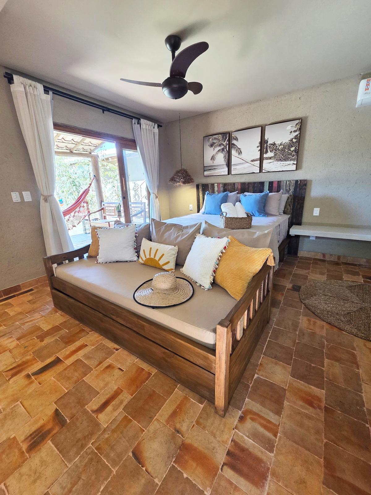 В доме могут с комфортом разместиться до 6 человек, есть две спальни (обе с двуспальными кроватями), одна ванная комната, гостиная с двумя односпальными кроватями, кухня с открытой планировкой и внешняя зона обслуживания. Также есть передний балкон с столом и скамейкой, откуда можно наблюдать участок моря и его постоянную смену цветов. Подписаться Casa Pavao Caraiva НОВЫЙ ГОД (около 10,5 тыс.) и КАРНАВАЛ (около 6 000) — ПРЕДВАРИТЕЛЬНАЯ КОНСУЛЬТАЦИЯ.