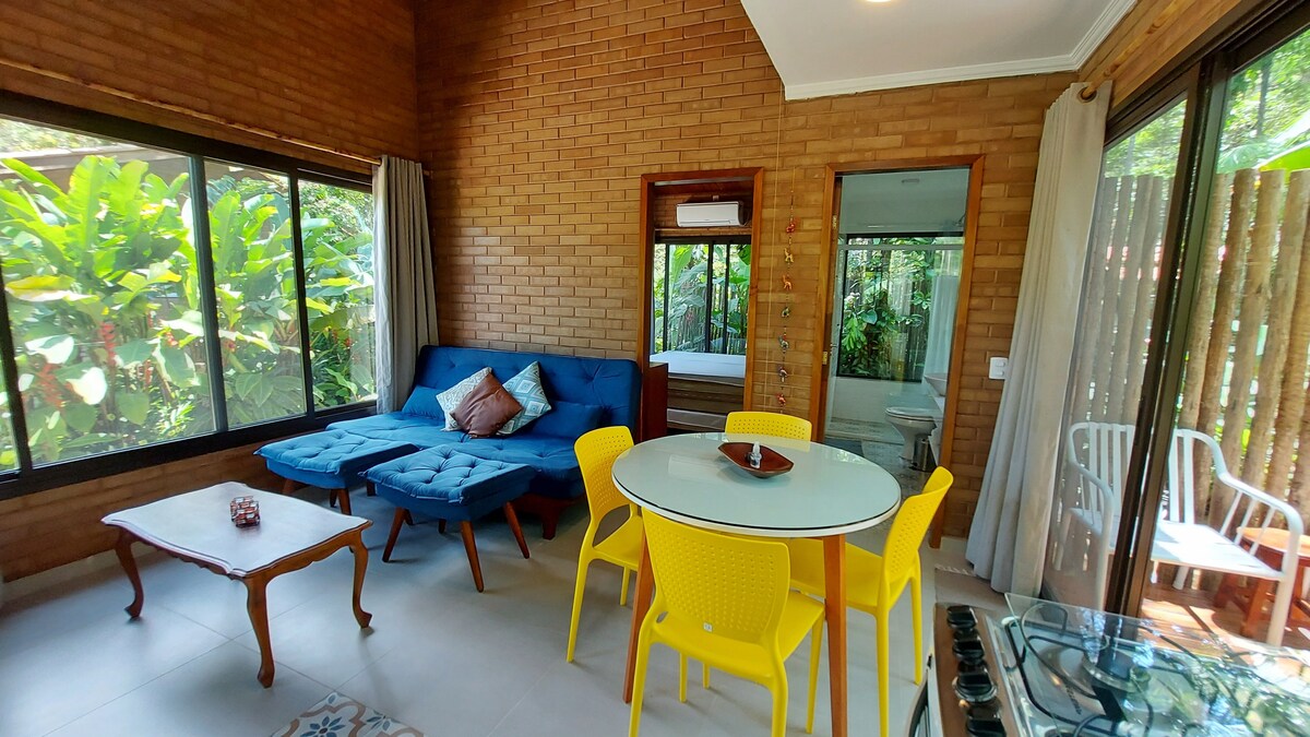 Ваше пребывание - это необычный опыт. Ознакомьтесь с отзывами гостей, которые были очарованы шале бронирования. Уютное место в гармонии с природой. Безопасный кондоминиум в 800 м от пляжа (район канала Сан-Себастьян и Ильябела). Терраса с офуро и обеденным столом. Гриль для барбекю и сад с видом на лес. Расслабьтесь и созерцайте лес, пение птиц и ручей. Это идеальное место для пар. Вместимость 4 человека. Wi-Fi и открытый телевизор.