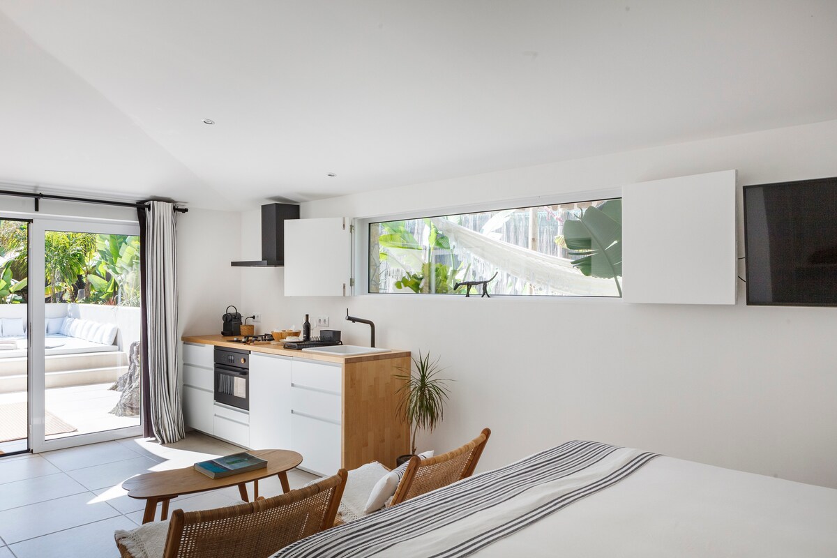 Павильон у бассейна - это уютные и расслабленные два люкса и кухонное пространство, с которого открывается вид на пышный сад и который идеально подходит для радостного и расслабляющего отдыха. Обладая высокими стандартами из простых, но сложных материалов, таких как микроцементные полы , лепные стены и льняные шторы, и успокаивающие естественные цвета, он гармонично сочетается с окружающей средой. Большие двери патио выходят в просторный частный сад с деревянными настилами, бассейном с подогревом, шезлонгами и столом.