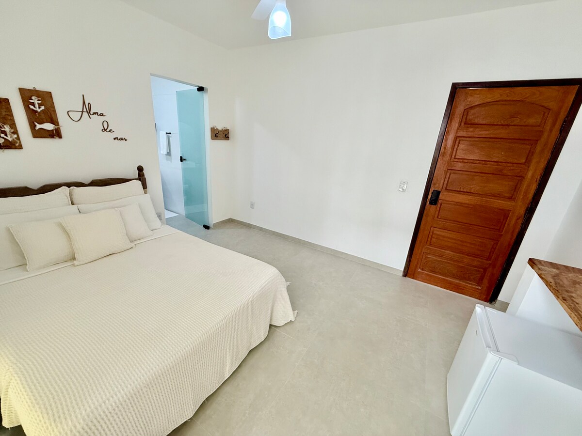 Расслабьтесь в этом уникальном и тихом месте. Маленький домик - это мечта. Меблировано и очень уютно. Возможность размещения до трех человек. К услугам гостей люкс, однокомнатная и американская кухня. В апартаментах и в одноместной комнате есть вентилятор и кондиционер. Жилье расположено в 700 метрах от пляжа Короа Вермелья и торговли в целом. Расстояние до Порто-Сегуро составляет 17 км. Приезжайте и проведите незабываемые моменты в этом историческом и очаровательном месте, в стране индейцев Патаксоса, спокойных и чистых пляжей.