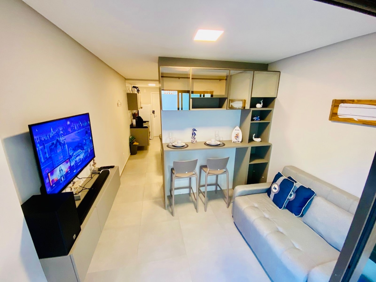 40 metros da praia e 700 da pracinha do Centro. * Flat com 34 m2, 02 quartos, sendo 01 REVERSÍVEL do ambiente da sala (atentem a esta informação e as fotos) ambos com ar split e smart tv. * Acomoda 05 pessoas, sendo 01 cama casal, 02 solteiros e 01 colchão extra. * Cozinha completa: cooktop, micro-ondas, geladeira.......etc * Enxoval completo * Wi-Fi * TV a cabo (box TV) * Área de lazer com piscina, redario, salão de festas. * Parquinho infantil. * Estacionamento privativo. * Serviço de quarto