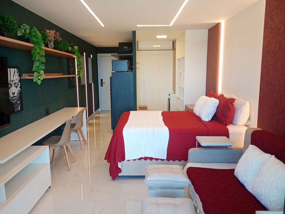 Наслаждайтесь уютной и красиво оформленной студией прямо перед пляжем Армасан. В распоряжении гостей двуспальная кровать, полностью оборудованная кухня, быстрый Wi-Fi и все необходимое, чтобы вы чувствовали себя как дома. Здание является лучшим в Сальвадоре для краткосрочного пребывания — новое, безопасное и полное очарования. Самая большая терраса на крыше в Баии и все удобства, которые вы заслуживаете. Идеально подходит для пар, друзей или деловых поездок. Откройте для себя Сальвадор с комфортом, практичностью и стилем!