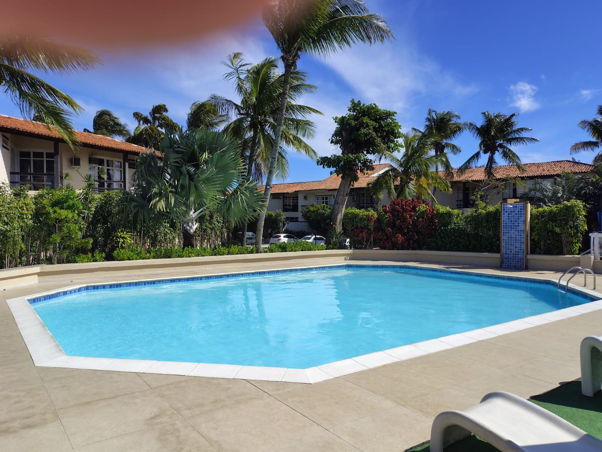 Уютная квартира в кондоминиуме с парковкой и бассейном. В спальне и гостиной есть Wi-Fi, кондиционер и потолочный вентилятор; полностью оборудованная кухня с несколькими кухонными принадлежностями и приборами; двуспальная кровать и 2 двуспальных дивана-кровати. Рядом с улицей Руа-даш-Педрас и пляжами. Телевизор с интернетом, чтобы гость мог ввести свой пароль. Я не предоставляю продукты питания и шампунь. Я предоставляю постельное белье, полотенца, мыло, жидкое моющее средство и туалетную бумагу. Мы не принимаем животных.