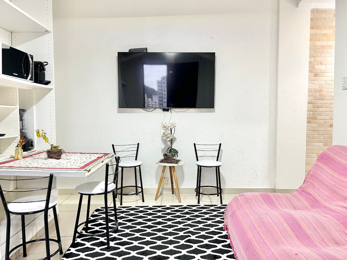 ОЧЕНЬ ПРОСТОЙ доступ для тех, кто приезжает из SP на автомобиле или автобусе! Квартира расположена на первом пляже, когда вы приедете в Сантос, Пляж Praia do José Menino ;) Парковка в здании и автобусная остановка почти впереди. **Для заселения по воскресеньям, пожалуйста, заселяйтесь до** Квартира-студия площадью 33 кв. м, недавно отремонтированная, перед пляжем, с новой мебелью, выбранная с большой любовью для вашего комфорта. Идеально подходит для пары, но вмещает до 4 человек. Приезжайте в «Nossa Apé 2», чтобы провести несколько дней в Сантосе!
