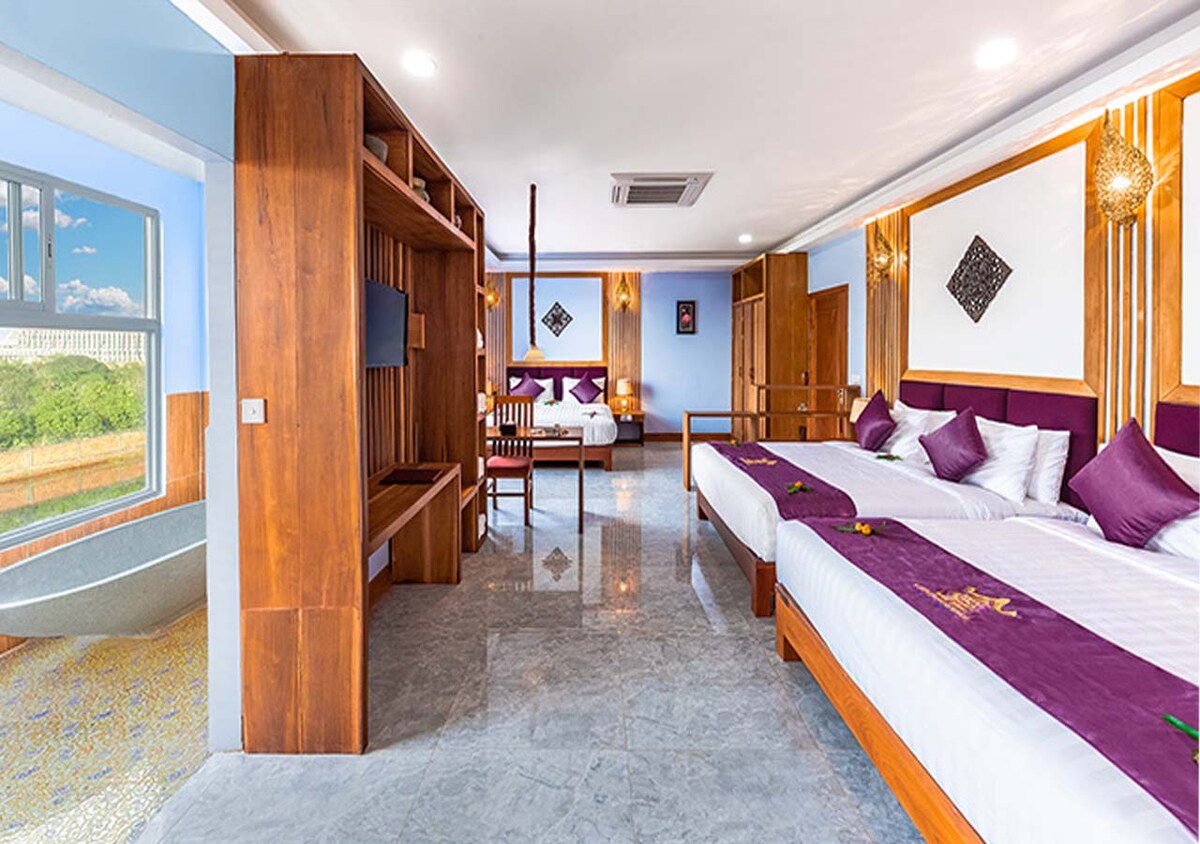 Это уникальное место имеет свой собственный стиль. Наше деревянное кхмерское бунгало было спроектировано для вашего комфорта и расслабления, на этапе с умиротворяющим камбоджийским ландшафтом. Здесь мы сочетаем традиционное жилье и современные стандарты, чтобы наши гости могли в полной мере наслаждаться своим пребыванием. Наше бунгало под названием «Кхем» - это название кхмерского традиционного музыкального инструмента. Музыка сочетается с гармонией, и это именно то, что мы теперь желаем нашему гостю: самое гармоничное пребывание.