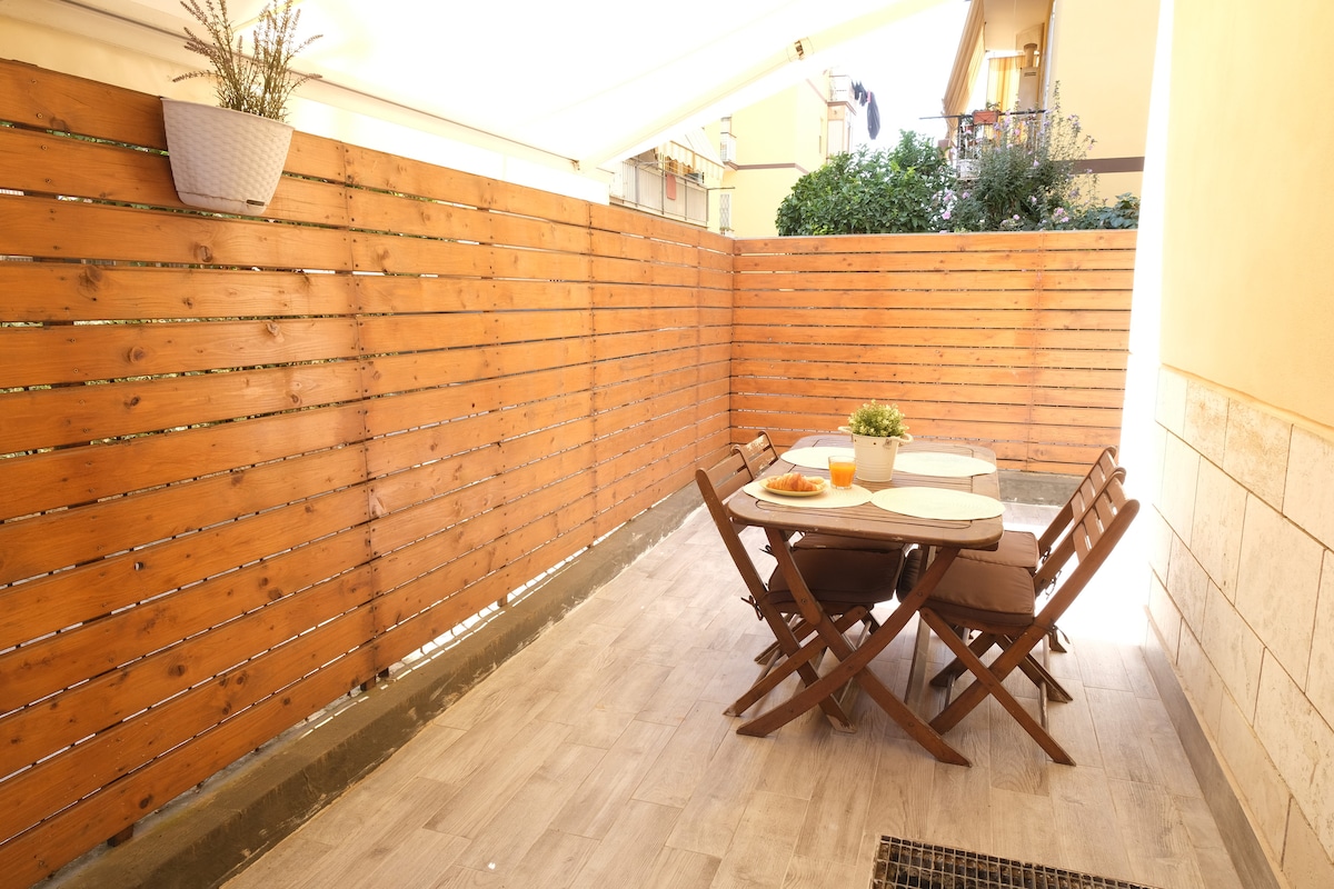 Восхитительная квартира (не общая) с большой террасой, расположенная в недавно построенном здании с современным дизайном, класс энергопотребления (A). В доме есть: - гостиная с удобным диваном-кроватью и телевизором; — мини-кухня, оборудованная всеми принадлежностями (духовка, микроволновая печь, посудомоечная машина, индукционная варочная панель). — 1 двуспальная кровать размера Queen size со шкафом. - 1 ванная комната с душем; - 1 большой двор. - По запросу вы можете забронировать парковочное место в том же здании за дополнительную плату в размере 15 евро в день.