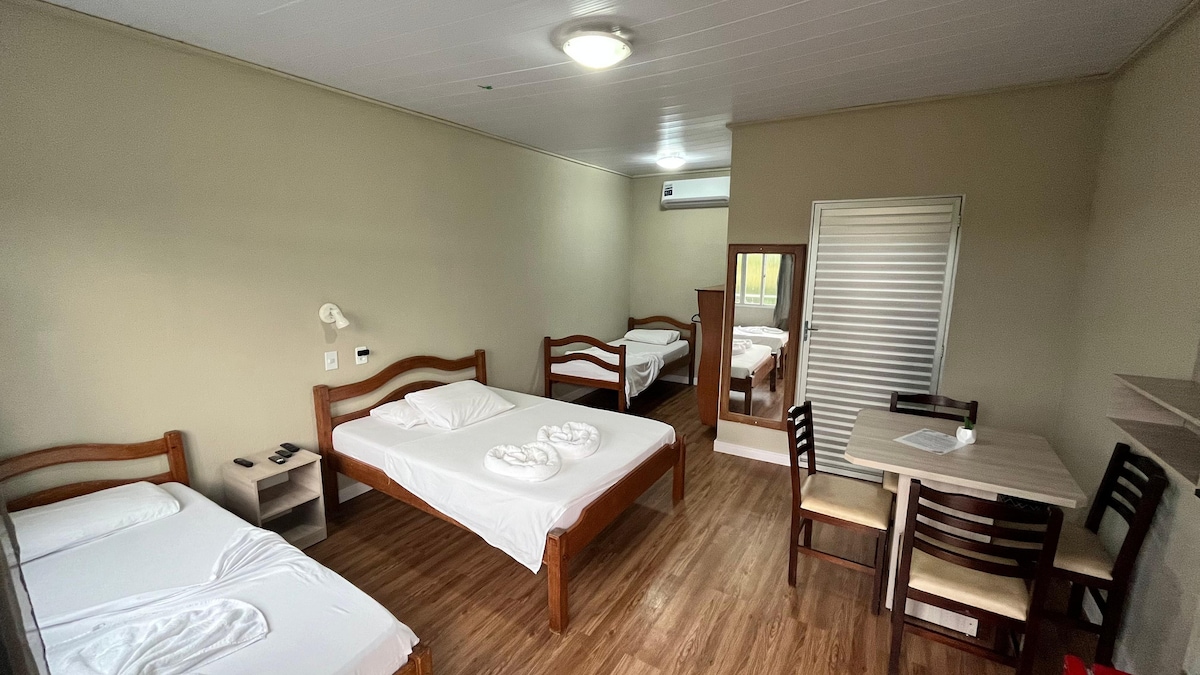 Hospede-se na suíte 03 da Pousada Castro: Ambiente familiar para você relaxar e se divertir com a família. Na suíte tem 1 cama de casal, 1 de solteiro e armador de rede; podendo hospedar até 3/4 pessoas. Ao se hospedar aqui, você ganha à cortesia um delicioso café da manhã regional.