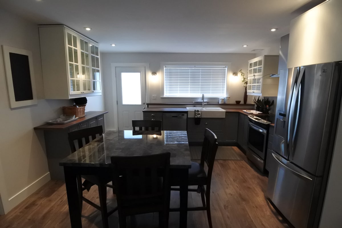 Наслаждайтесь «домом вдали от дома» в AirBnB с красной крышей. В этом красивом, чистом и гостеприимном жилье есть 2 большие спальни, совершенно новая кварцевая кухня, оборудованная всем необходимым, и ванная комната из 5 человек с двуспальной раковиной. Красная крыша удобно расположена в пешей доступности от необычного центра Принса Руперта, где есть множество магазинов, развлечений и ресторанов! Приезжайте домой на просторную уличную парковку, удобные кровати, частную прачечную и тихое рабочее место!