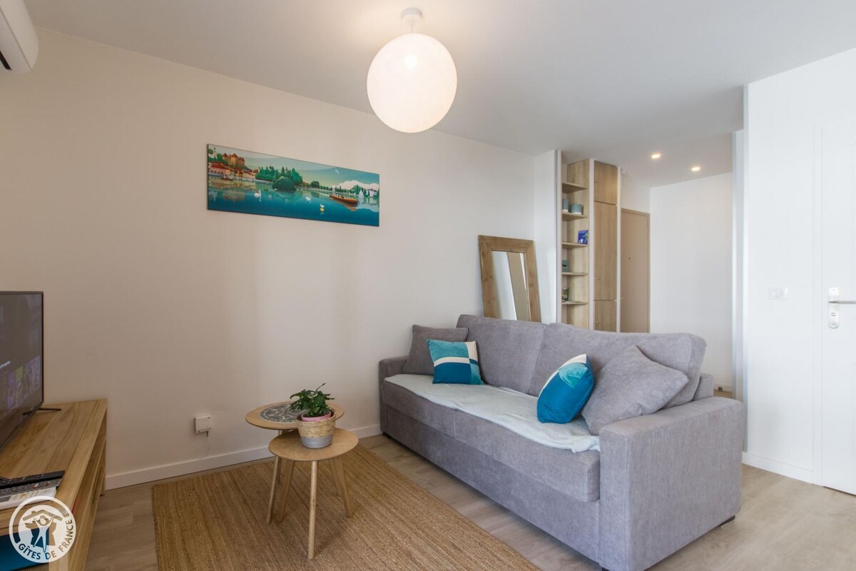 4-звездочная квартира ⭐⭐⭐⭐ ГОРОДСКОЙ ОТДЫХ ПРЕМИУМ-класса от Gîtes de France. В центре привилегированного района Анси (Золотого треугольника) с озером, центром города, Старым городом или множеством магазинов и ресторанов, до которых можно добраться пешком или на велосипеде. Квартира с прекрасными удобствами: частное парковочное место в подвале, балкон, полностью оборудованная кухня, современная и уютная атмосфера, Wi-Fi...