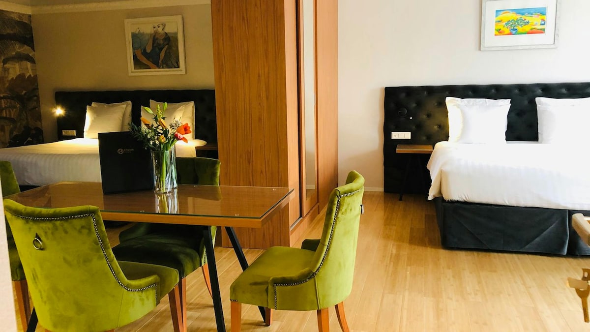 В просторном номере Grand Deluxe с впечатляющей планировкой могут разместиться семьи или небольшие группы. В номере две кровати размера Queen size и удобный диван-кровать для пятого гостя. К услугам гостей кухня и обеденный стол, идеально подходящие для перекуса или обеда после дня, проведенного в городе. Расслабьтесь под тропическим душем или в теплой ванне и насладитесь домашним уютом и комфортом.