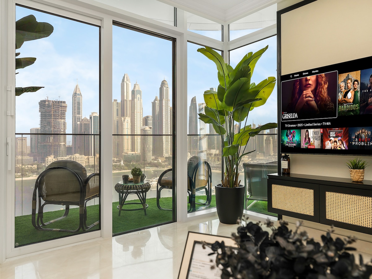 Это красивая квартира с 1 спальней для 3 гостей. К услугам гостей большая гостиная с потрясающим видом и современная кухня со всей необходимой техникой. В тихой спальне установлена большая двуспальная кровать размера King size. С вашего собственного балкона открывается идеальный вид на потрясающие закаты над Палм-Джумейрой. — отличное расположение рядом с Палм, морем, Мариной - 2 ресторана, СПА, фитнес, 2 бассейна. — Обслуживание номеров 24/7, еда и напитки. - детская кроватка для детей до 3 лет; — Playstation 5, Netflix, Amazon Prime.