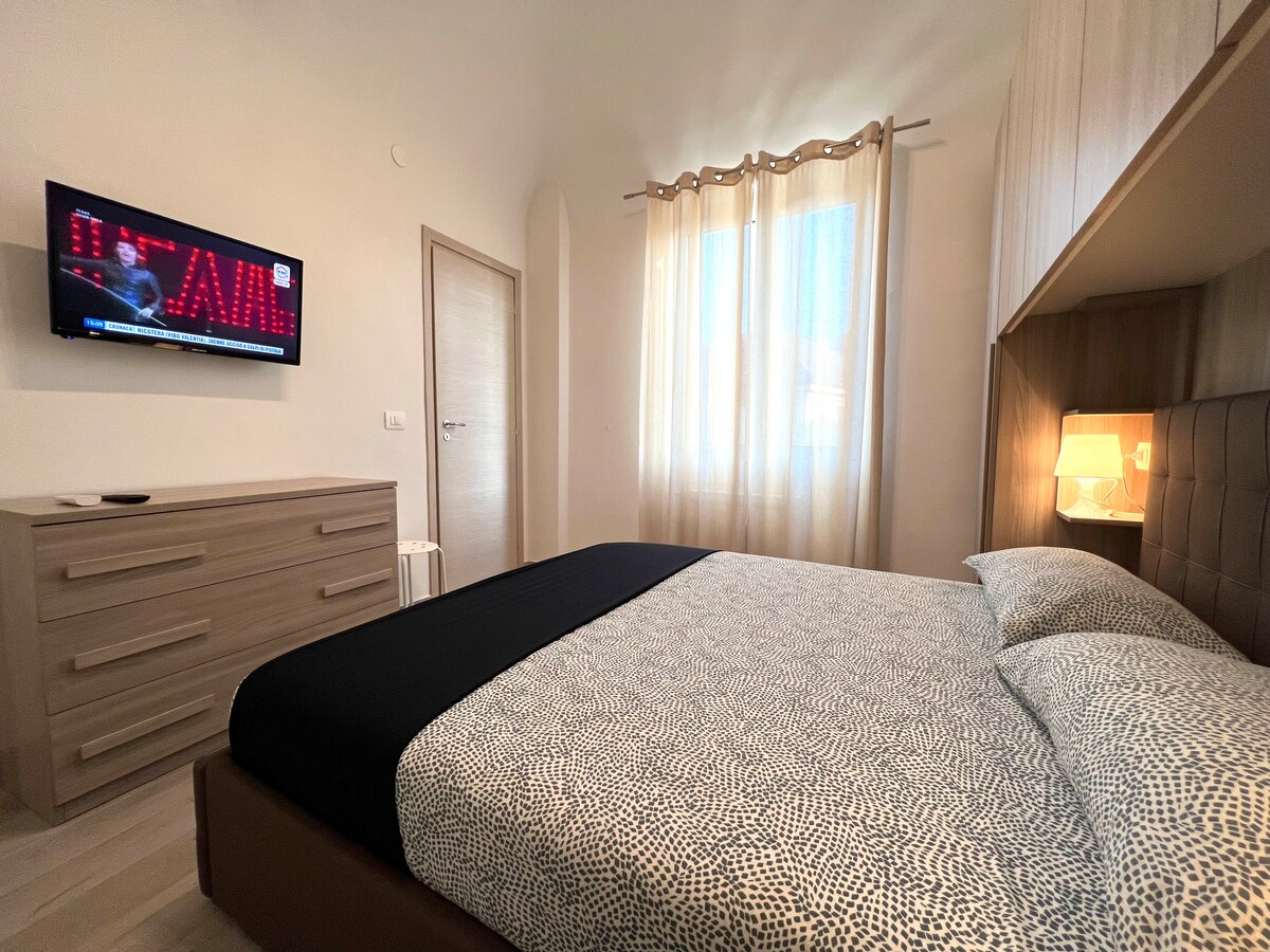 Bilocale completamente ristrutturato, costituito da camera da letto, cucina abitabile fornita di piano a induzione, forno a microonde e normale, frigorifero, macchina da caffè nespresso. In ogni stanza è presente SMART TV di ultima generazione, WIFI e Alexa Echo. Antibagno e bagno con grande box doccia. Il bilocale è situato all'interno di un cortile condominiale, per accedere è necessario salire una breve rampa di scale.Dista a due passi dalla stazione zona giardini pubblici a 100 m dal centro