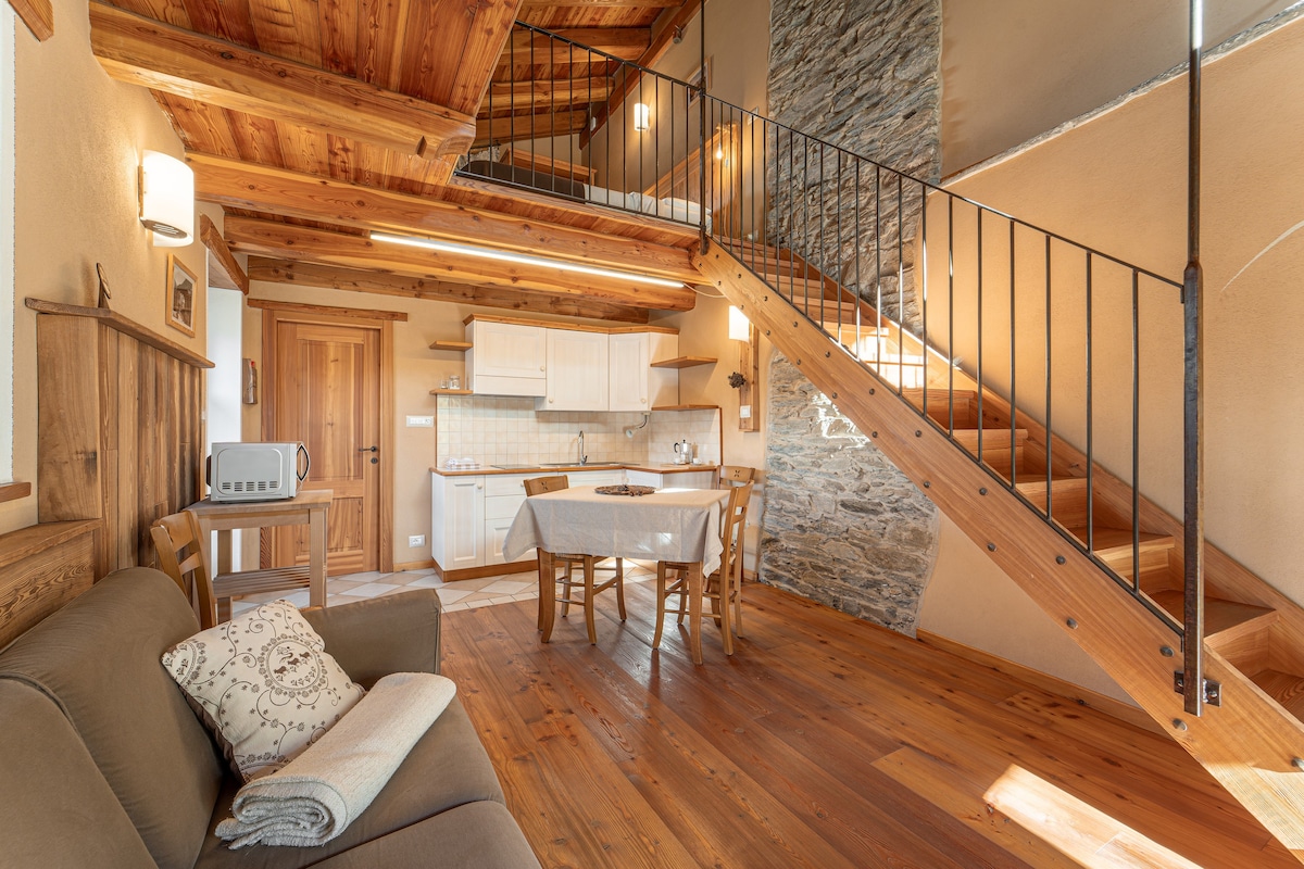 Access the accommodation by walking through the small hamlet and climbing the steps to the second level of the stone portico on the south side of the building. The elevated position of the apartment offers a beautiful view from the balcony of the Col d’Esischie peaks and the dense larch forest. The accommodation is spread over two levels: the first features a comfortable living area with a modern kitchen equipped with an electric cooktop, refrigerator, sink, and dishes.