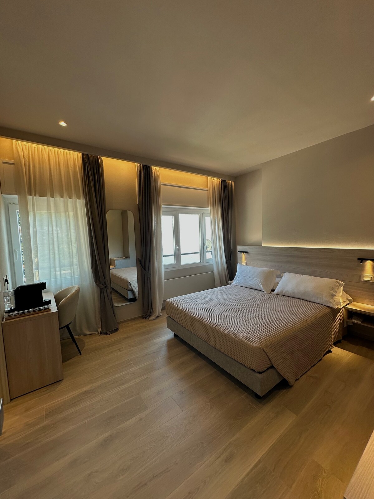 Современная комната с минимальным декором. Рекомендуемое жилье для кратковременного проживания. Очаровательный сад-парк, завтрак императора, пляж в 100 метрах и центр Форте-деи-Марми всего в 3 км. Возможность романтического ужина в парке. *Фотографии являются репрезентативными для типа номера; номер, назначенный по прибытии, не гарантированно будет таким же, как и номер на фото.