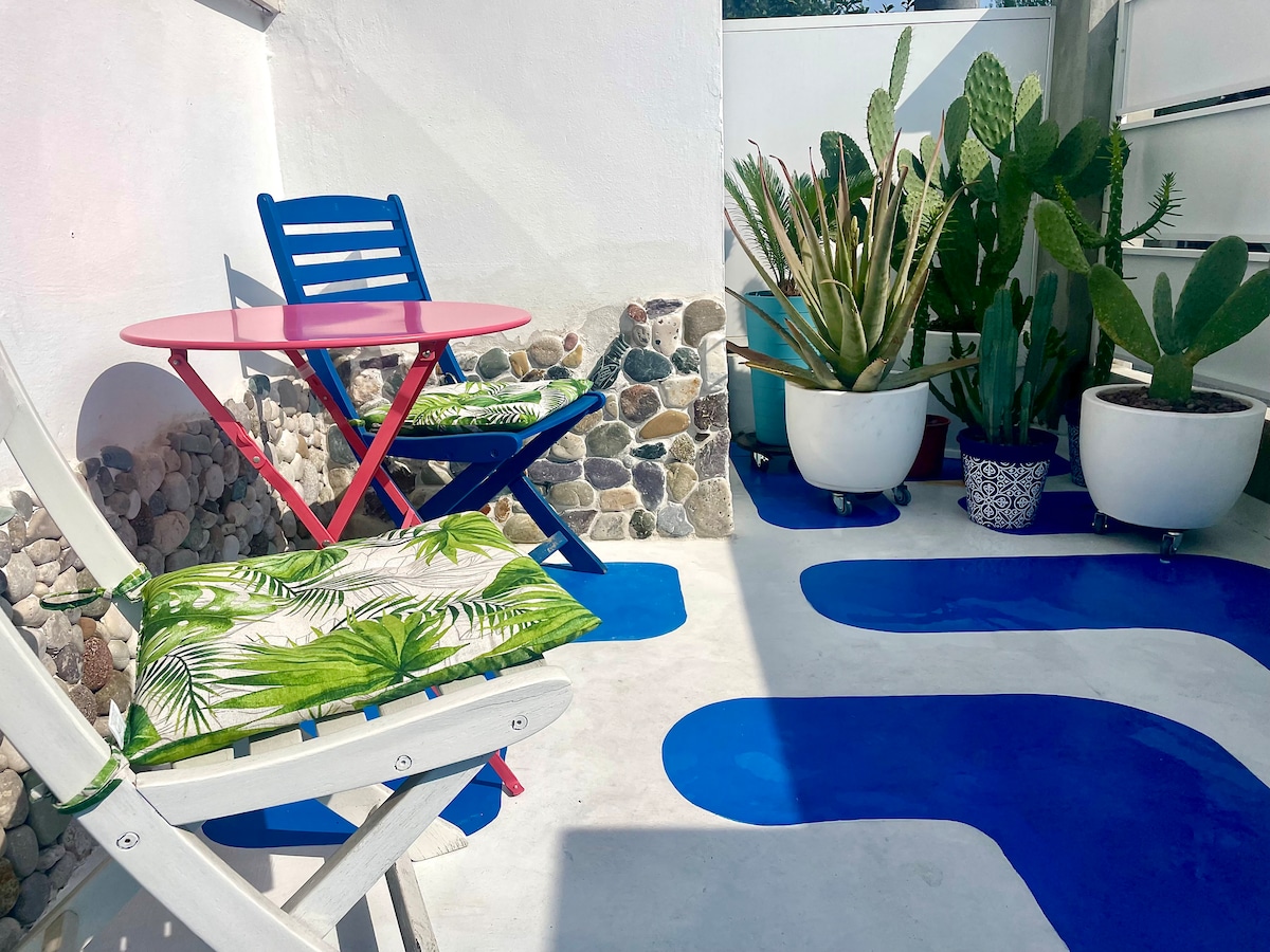 Отдельная квартира с частной на открытом воздухе в греческом стиле для 2 человек с полноценной кухней (посуда, посуда, холодильник, плита, посудомоечная машина), ванная комната с душем, постельное белье, полотенца, Wi-Fi, Alexa. Во дворе два стула и журнальный столик для моментов отдыха. Внутри дома запрещено курить, но можно на открытом воздухе.