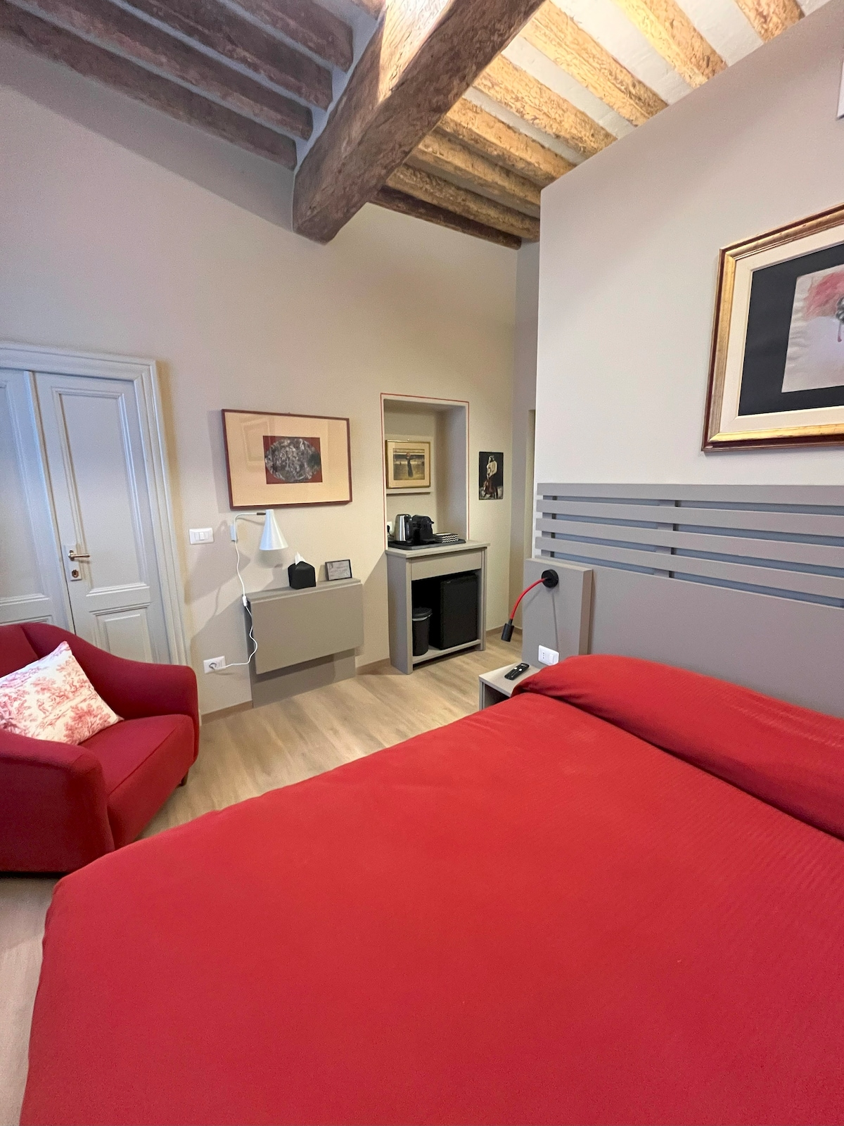 Camera ROSSA 1° piano. Può avere letto matrimoniale oppure due letti singoli. E’ dotata di armadio, scrittoio pieghevole, frigobar, macchina Nespresso con capsule di caffé, bollitore con bustine di the e tisane, zucchero, asciugamani e biancheria da letto. Il bagno privato è dotato di asciugacapelli, assorbenti igienici, shampoo, bagno schiuma e sapone per le mani. Sono date in dotazione alcune bottigliette di vetro per rifornirsi di acqua microfiltrata presso l’erogatore posto al piano terra.
