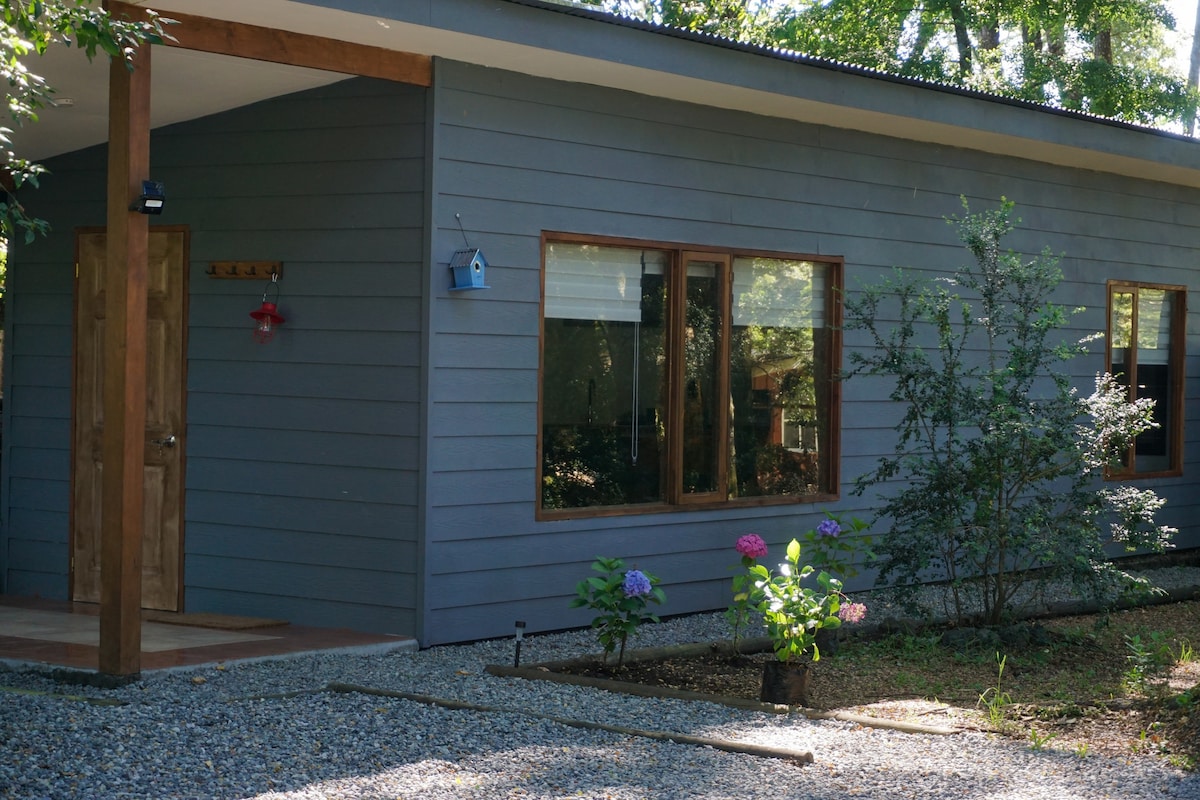 The cabin has a natural feel and rustic touch within amazing surroundings of the native forest and trees all around you. The cabin has been built with native and sustainable wood. it is well equipped. Is very cute and cozy space with a large veranda with an outdoor seating. There is a nice river with access within the property with a picnic table next to it to enjoy listening the river. Big sunny green garden, picnic table to enjoy the view of the mountains, a fire-pit and couple of hammocks.