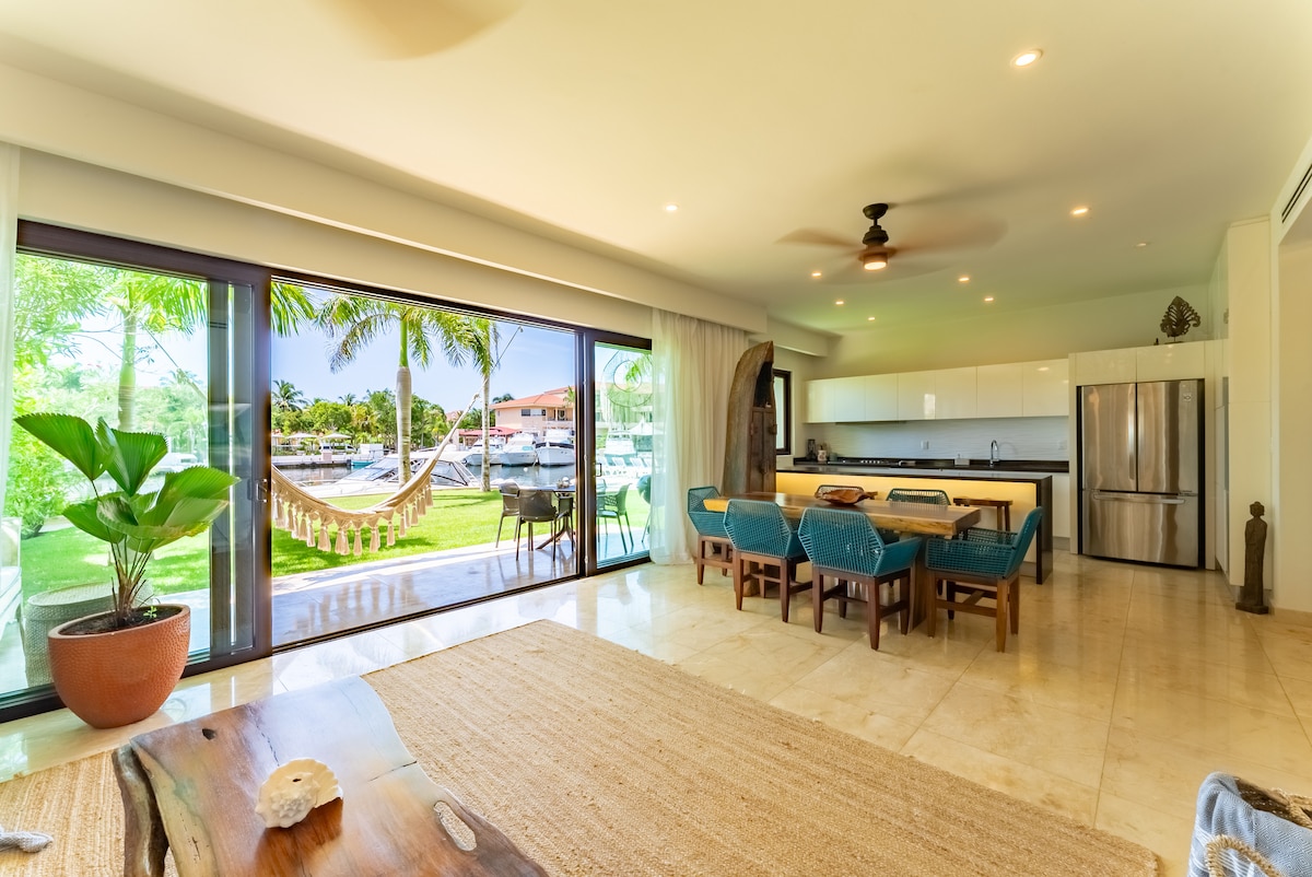 Частная терраса у пристани — Пуэрто-Авентурас Просыпайтесь под естественным освещением и любуйтесь видом на пристань с собственной террасы с прямым доступом к панорамному бассейну. Современная и просторная квартира на первом этаже с 3 спальнями, 2,5 ванными комнатами и удобствами курортного типа в эксклюзивном закрытом комплексе. Идеально подходит для семей и групп, ищущих комфорт, уединение и развлечения — прогулка до пляжа и пристани, включая сапсерфинг и серфинг.