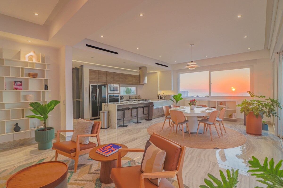 Забронируйте проживание, чтобы насладиться роскошью, комфортом и невероятным видом на океан в этом стильном пентхаусе 6 на желанном пирсе ❤️ 57 в романтической зоне Пуэрто-Вальярта. Прямой вид на океан и пирс/пляж Лос-Муэртос со стеклянными окнами от пола до потолка. Шаги до Малекона, лучших ресторанов, модных баров и художественных галерей. Наслаждайтесь панорамным видом на океан, горы и Старый город с лучшей крыши в Вальярте с панорамным бассейном с подогревом, террасой, тренажерным залом, джакузи, домиками и баром с полным спектром услуг. VIP-консьерж-сервис.