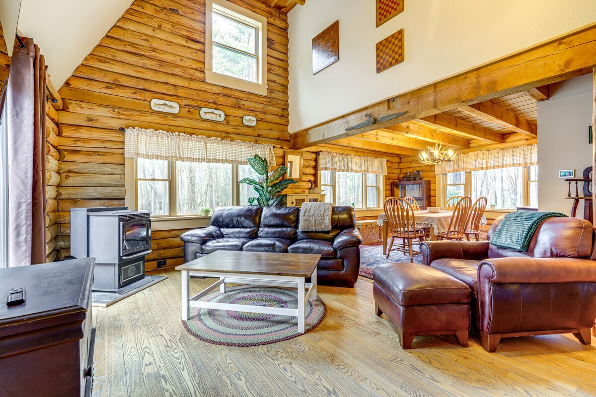 Спокойный бревенчатый домик площадью 8 акров. Поистине жемчужина: тихая, уютная, уютная, солнечная каюта со сводчатым потолком. Красивые сады, теплый электрический камин, в нескольких шагах от водохранилища Аткинса и пешеходных маршрутов. Вы почувствуете себя уединенно, но рядом с местными достопримечательностями. Всего в 7 минутах езды находятся Амхерстский колледж, Гэмпширский колледж, Смит Колледж и гора Холиок.
