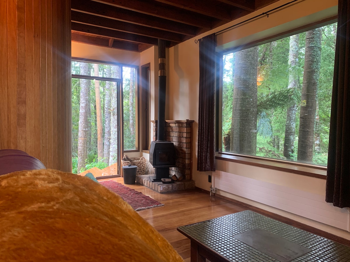 Остановитесь в этой уютной хижине, расположенной в двухквартирном доме от главного дома, автономном со скромными кухонными принадлежностями. Кровать размера Queen size наверху со спиральной лестницей, ведущей вниз в гостиную с камином. Послушайте пение птиц и бурлящий ручей Суонсон. Потрясающие пейзажи, спа/гидромассажная ванна и сауна, а также бильярдный стол в главном доме. Этот уединенный отдых, расположенный среди местного тропического леса, находится всего в 10 минутах езды от автомагистрали и в 20 минутах от пляжа Бетеллс.