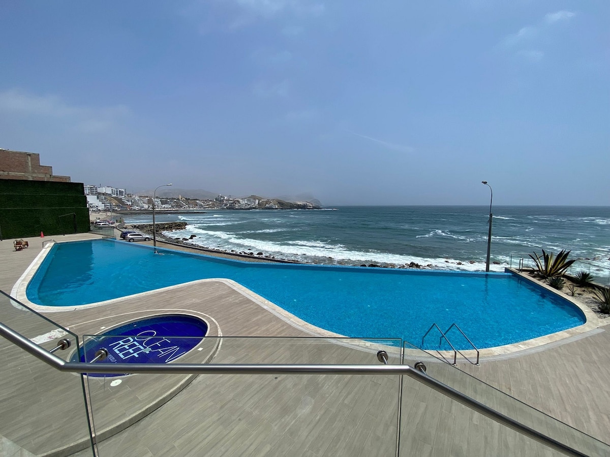 Квартира на первом этаже, в кондоминиуме Ocean Reef - Плайя-Сан-Бартоло. Balneario расположен к югу от Лимы, км 51 Panamericana sur. Наслаждайтесь бассейнами, играми, тренажерным залом, свежим воздухом и эксклюзивным морем Сан-Бартоло. На этом песчаном и каменном пляже вы можете плавать и заниматься серфингом, здесь есть 4 варианта волн. Вы ничего не пропустите, так как вы можете найти рестораны, магазины и различные магазины в деревне.