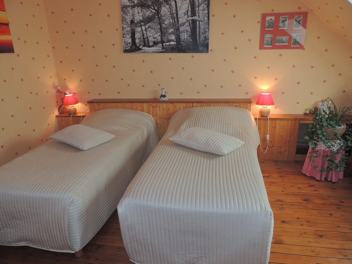 Тихая комната в сельской местности недалеко от города Фалез и шоссе A88 Caen Sées. Бесплатный завтрак, возможность приема пищи в столовой и хранения еды в холодильнике (принимать пищу в комнате запрещено), письменный стол в вашем распоряжении для удаленной работы. Домашние животные запрещены.