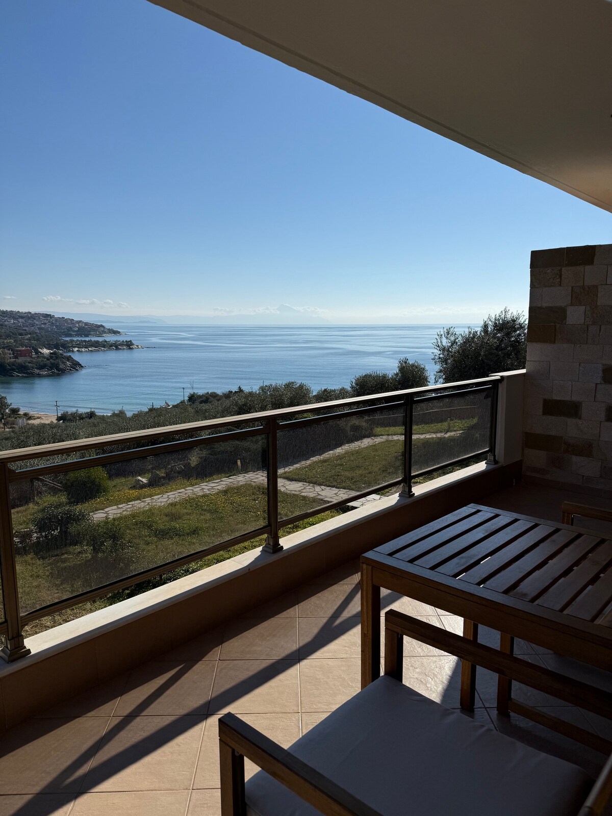 Отдохните в очаровательной деревне Пиргадикия, где вас ждет пентхаус с панорамным видом на море. Наш пентхаус, расположенный в живописной бухте Ситония в Халкидиках, предназначен для того, чтобы насладиться прекрасными видами, с большими окнами и стеклянными дверями, выходящими на три балкона, откуда открывается панорамный вид на Эгейское море и Священную гору Афоса.