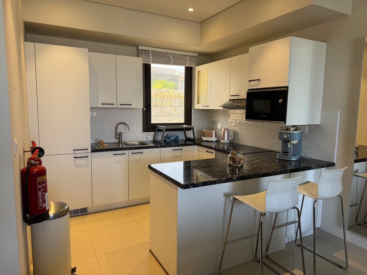 Elite 1 bedroom Apartment in Muscat Bay!exclusive beachfront gated compound. - Direct Access to a Private Beach -Resort-Style Swimming Pool + a vibrant kids’ play area -Cinematic Experience, largest smart TV. -Top-Tier kitchen Appliances in home— outdoor BBQ area. -Dedicated Car parking lot -Fast Wi-Fi -large balcoby with Pool and green view -multi capsule coffee machine -washing machine -super market delivery and cleaners on call