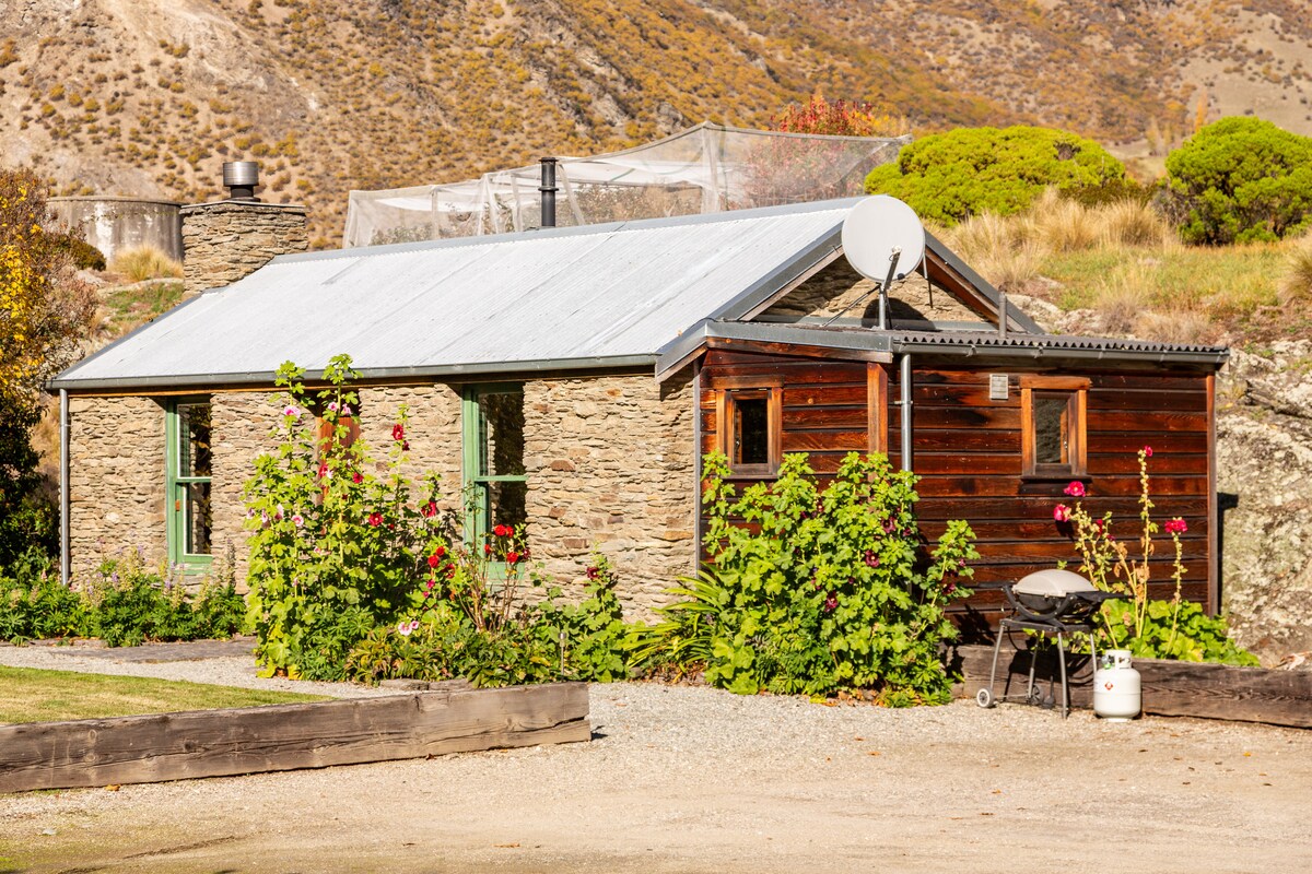 Original Historic Goldminers Stone Cottage located on the Gibbston River, bike and walking trail with easy access to local wineries. Featured in the latest edition of the NZ Lonely Planet guide - This award winning beautifully restored original Goldminers cottage dates back to 1874. Set in the heart of Gibbston Valley with 360 degree views of the Nevis Bluff, Mt Rosa and Waitiri station the cottage provides a peaceful and relaxing base to explore the surrounding area. The cottage interior is an open plan studio layout with a cosy sitting area at one end with a partly screened bedrrom area at the other end, with an adjacent separate bathroom. The bathroom is spacious with separate shower and bath. The bedroom area features a queen bed and you walk through to the lounge, dining and kitchenette area. The kitchen features a stove top and microwave combo oven. Fridge, kettle and toaster. The cottage is great for 2 guests, but can sleep 2 additional guests on the sofa bed in the sitting area, as this converts to a double bed and full linen is supplied. Cuddle up in front of the warm cosy fire, relax and unwind. Walking distance to 3 local wineries and walking trails to Nevis Bluff, Mt Rosa and Coal Pit Road. Situated directly on the new Gibbston River Trail you can bike to the Gibbston Tavern, Peregrine Winery, Gibbston Valley winery and AJ Hacket Bungy bridge. Then continue directly onto the Queenstown Trails to Arrowtown and Queenstown from the door. Easy access to the Gibbston Valley station new Rabbit Ridge bike trails recently opened. Gibbston is 10 minutes drive to Arrowtown and 20 minutes to Queenstown Airport. Cromwell and Bannockburn are 20mins drive. Wanaka is 40mins either via the Crown Range or by going through Cromwell. The cottage is easy access to all activities in and around Queenstown and very handy to the many ski fields in both Queenstown and Wanaka in the winter. Set in its own garden on our 6 acre property where we built a Strawbale house you are welcome to visit the horses, collect eggs from our chickens and pat our sheep. Help yourself to our seasonal produce from the garden. Bikes are available for use to explore the trails Firewood is supplied Outdoor furniture and a BBQ are provided for outdoor living *Linen supplied and included with rental. *Visitors to clean-up and leave the property as found.