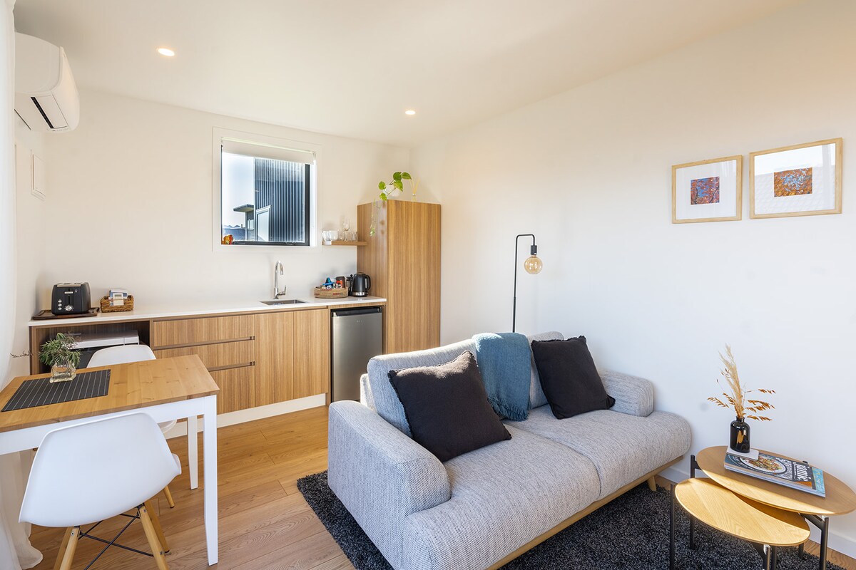Spacious 35 sqm, stand alone guest house has stunning lake, forest and mountain views. Perfect for couples or solo travelers. Your own private deck to enjoy a drink. Ten minute walk to the lake. Five min drive to Wanaka township, Treble Cone 30 mins, Cardona 45 mins. Private parking, heat pump/air con, smart tv, bathroom with underfloor heating, heated towel rails, separate sitting room & kitchenette: bar fridge, microwave, toaster. Please note; no cooking facilities such as stove/hob or oven.