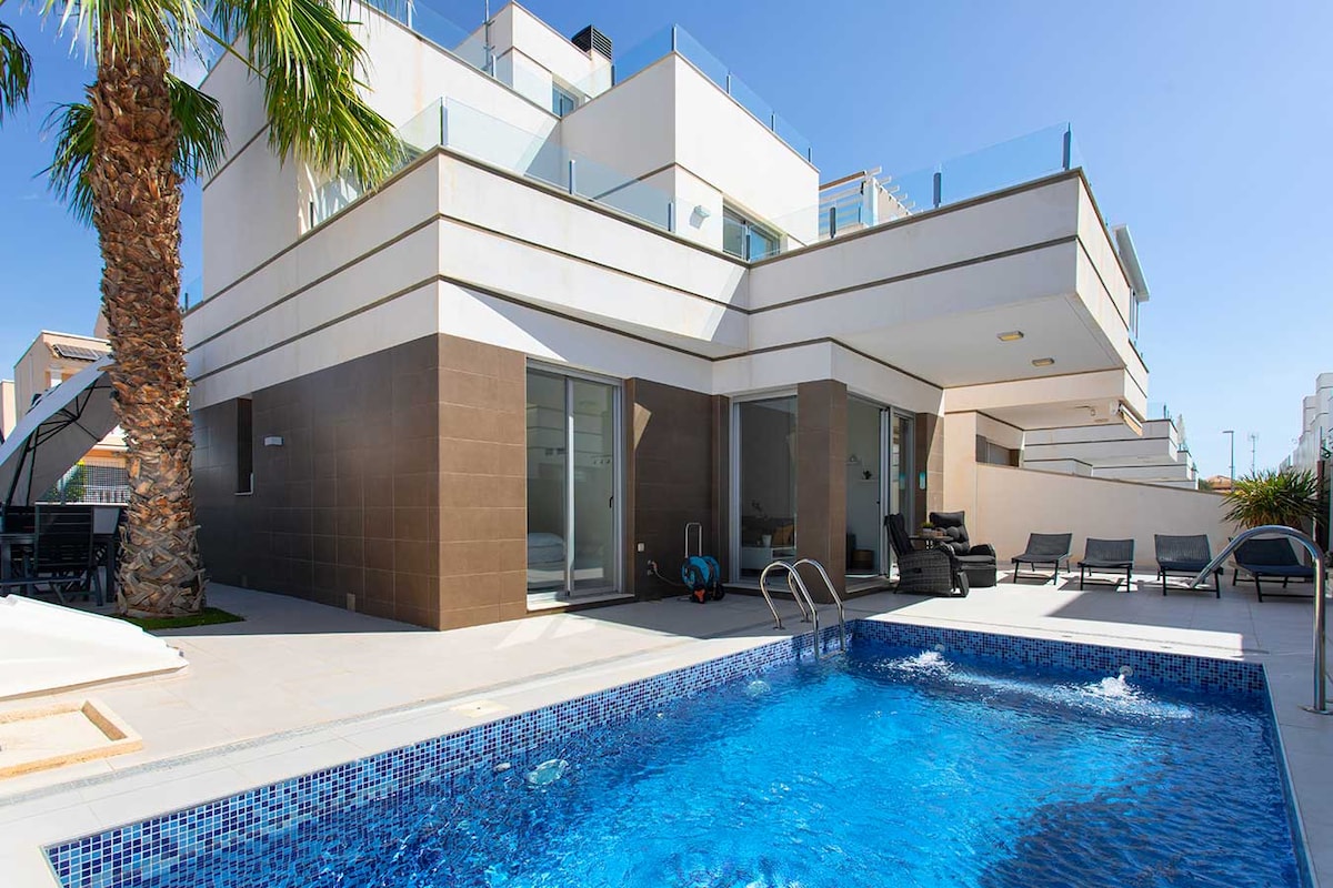Golf, strand, barer, restauranter, storby eller rolig avslapping. Ta med familien eller venner og nyt dette elegante bostedet. Den helt nye luksuriøse villaen har en rekke fasiliteter. Privat hage og bassengområde med ulike sitteplasser, solsenger og grill, perfekt for avslapning utendørs. Du kan boltre deg over tre etasjer med en stor takterrasse hvor du kan nyte utsikten mot byen og mot havet. Aircondition og raskt internett. Vi tilbyr 3 dobbeltsenger 160*200 og 4 enkeltsenger 90*200.