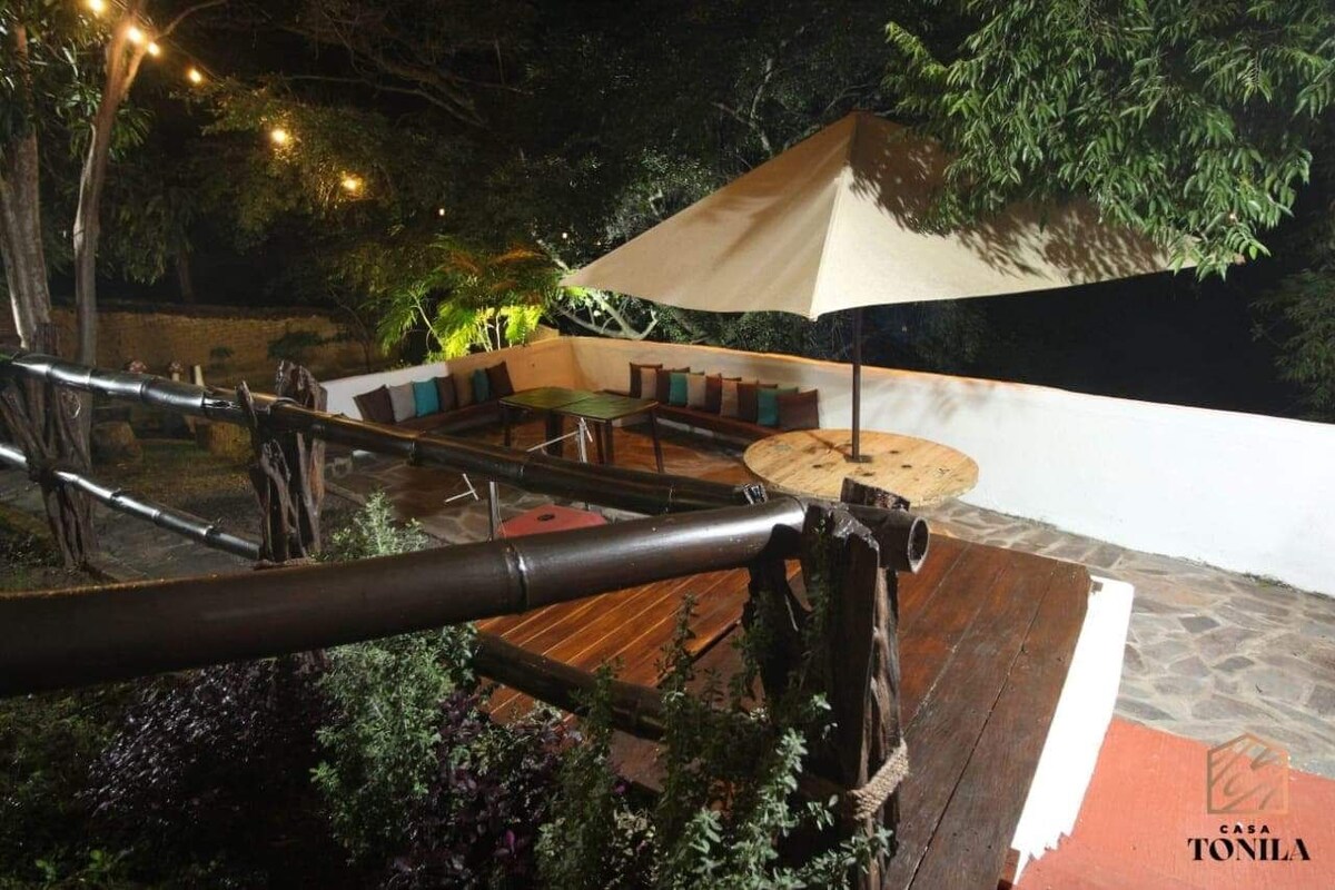 Charming countryside house located in a peaceful setting in Tonila, Jalisco, just 15 minutes from Colima, surrounded by a vast green garden and natural beauty. The house boasts spacious interiors, perfect for family enjoyment, and large windows that offer views of the outdoors. Ideal for those seeking family time, relaxation in a pleasant climate, or hosting family events of between 20-30 people (by prior arrangement) with 2 inflatables available for rent.