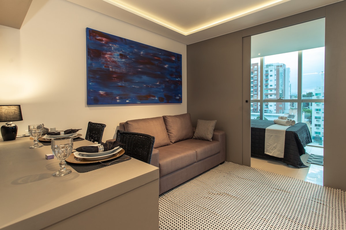 Потрясающая квартира высокого стандарта с 2 спальнями с ванной комнатой, изысканным балконом с мангалом, американской кухней. Открытый бассейн на террасе. Ваши питомцы приветствуются, если они обучены и не могут быть одни в квартире, потому что, если они лают и беспокоят соседей, кондоминиум взимает штраф, который будет передан гостю Airbnb.