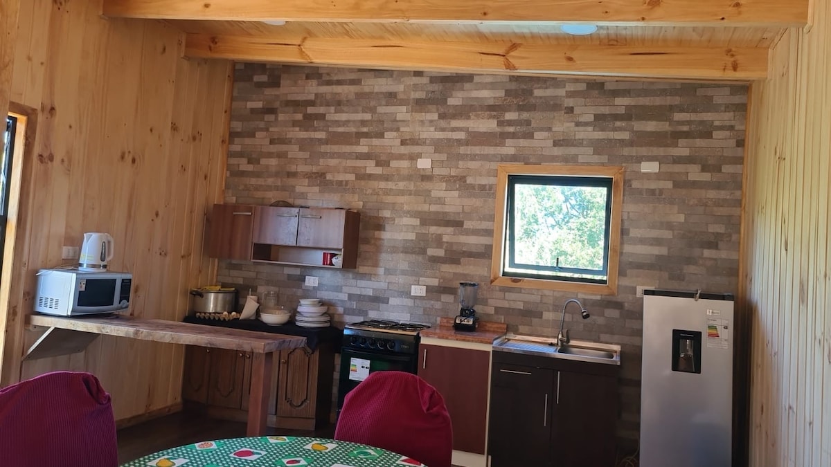 Cabaña individual, con patio, estacionamiento y ambiente totalmente privado. Cuenta con acogedoras habitaciones, cocina e intalaciones de primer nivel. Estarás rodeado de naturaleza, cerca de todos los atractivos naturales. A 3 minutos de la playa de Calcurrupe, río, zonas de trekking, centros de ventas