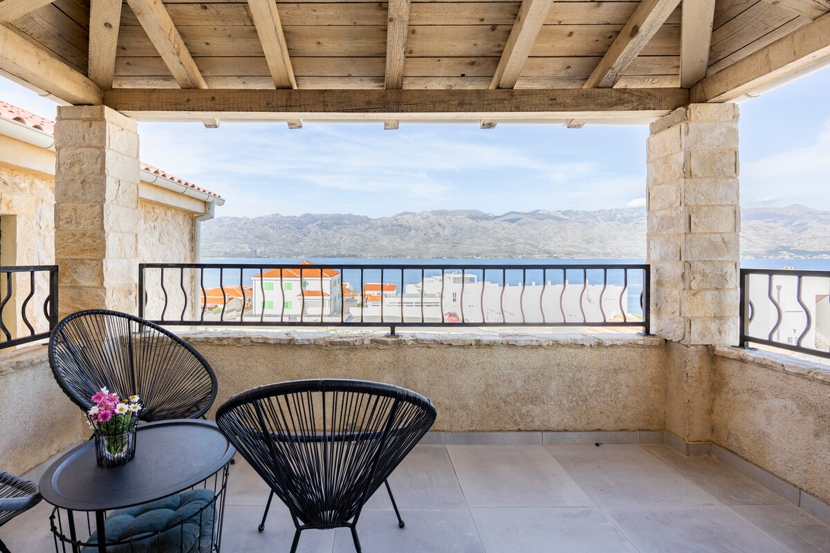 **New stone apartment near the sea with fantastic sea view**. Apartment 55m2 for 2 + 1guests . Spacious living room with sofa that becomes a double bed (smart TV, air conditioning)Kitchen (oven, dishwasher, coffee machine). 1. Bedroom (large double bed, wide wardrobe) with toilet (shower). The apartment has a private terrace (10m2) with amazing sea views. The terrace contains a table for 4 people.