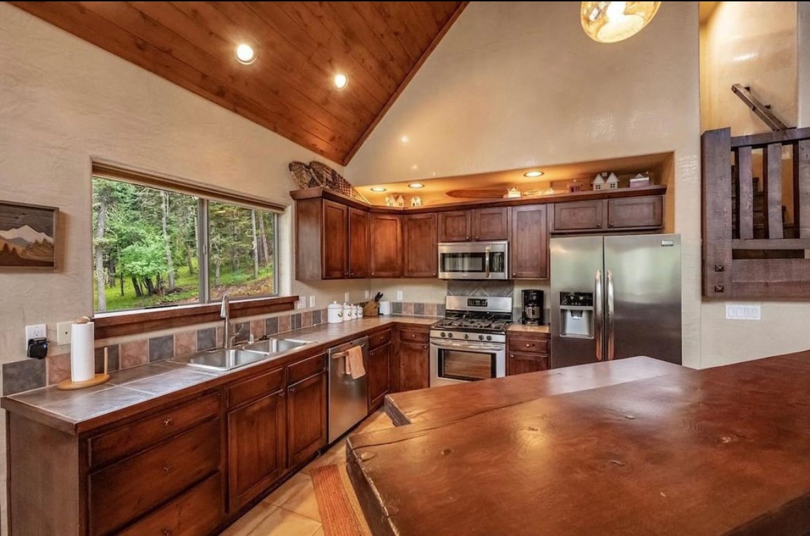 Эта полностью отремонтированная уютная хижина в Верхней долине - идеальное место, чтобы отдохнуть и восстановить силы с семьей и друзьями, наслаждаясь всеми видами и звуками, которые может предложить Красная река, штат Нью-Мексико. Carpe de Inn, расположенный в национальном заповеднике Карпон, - идеальное место, чтобы отдохнуть на большом патио, слушая реку Ред-Ривер, или отправиться в поход на гору прямо за задней дверью. РАСПОЛОЖЕНИЕ: Carpe de Inn расположен примерно в 4 милях от Ред-Ривер, штат Нью-Мексико, в Верхней долине. УДОБСТВА: весь домик был отремонтирован для удовлетворения потребностей семьи 21-го века со всеми современными продуктами, которые многие семьи ожидают и наслаждаются. Для удобства подключения к Wi-Fi установлен оптоволоконный Интернет, а 4 телевизора подключены, чтобы обеспечить последние новости о фильмах и каналах. Каждая комната была тщательно оформлена, с уютной, современной, но живой атмосферой отдыха в Нью-Мексико. Вся бытовая техника, светильники, сантехника, освещение, пол, стены, мебель были отремонтированы, так как мы отнесли хижину "в шпили" в 2020 году. Новый водонагреватель без бака обеспечивает бесконечный горячий душ при стирке и посуде. ЖИЗНЬ: ГОСТИНАЯ Carpe de Inn - это место, где можно расслабиться и расслабиться после дня рыбалки, пеших прогулок, шопинга, катания на лыжах или любых приключений, которыми вы наслаждаетесь. Гостиная оборудована 2 диванами и креслом вокруг дровяного камина. Есть телевизор H-D Smart Roku с доступом к вашим любимым потоковым шоу, а также подборка семейных карт/настольных игр. КУХНЯ и СТОЛОВАЯ: кухня Carpe de Inn полностью укомплектована и включает все необходимое для приготовления пищи для семьи. К услугам гостей плита и духовка, посудомоечная машина, микроволновая печь, кастрюли, сковородки, мультиварка, фен, сковорода, тостер, кофейник, Keurig и многое другое! Неважно, готовите ли вы легкую еду или полный семейный ужин, вы найдете все необходимое! Сядьте за обеденным столом или столом для пикника на улице. КРОВАТЬ и ВАННАЯ: у нас есть 3 отдельные спальни, две наверху и одна внизу. В каждой спальне установлены затемняющие шторы и новые потолочные вентиляторы. В спальне с кроватью размера King size внизу новый матрас с эффектом памяти. В ванной комнате есть ванна/душ, полная раковина и туалет. В ванной комнате наверху есть душ с полной раковиной и туалетом. ПРАЧЕЧНАЯ: Carpe de Inn оснащен стиральной/сушильной машиной для вашего удобства. Предоставляются моющее средство и простыни для сушки. ПАРКОВКА: Помимо парковки на подъездной дороге, на кольцевой дороге достаточно места для 3-4 автомобилей или трейлера с вашими любимыми горными игрушками. ПРИМЕЧАНИЕ: последняя миля езды - по грунтовым дорогам. У автомобилей и седанов не будет проблем с доступом в хижину в теплую погоду. Тем не менее, в зимние месяцы могут понадобиться полноприводные или полноприводные автомобили и цепочки. Зима в Нью-Мексико может быть непредсказуемой, поэтому, пожалуйста, подготовьтесь соответствующим образом. ДРУГИЕ ПОМЕЩЕНИЯ и УДОБСТВА передняя терраса – 4 стула Adirondack, стол и стулья. Боковая терраса – обеденный стол для пикника, гриль, кресла-качалки Adirondack, а также полный набор удобных сидений. Яма костровища (необходимо соблюдать местные ограничения по пожару, когда они на месте). Weber Propane Grill (необходимо убирать после использования) Ч