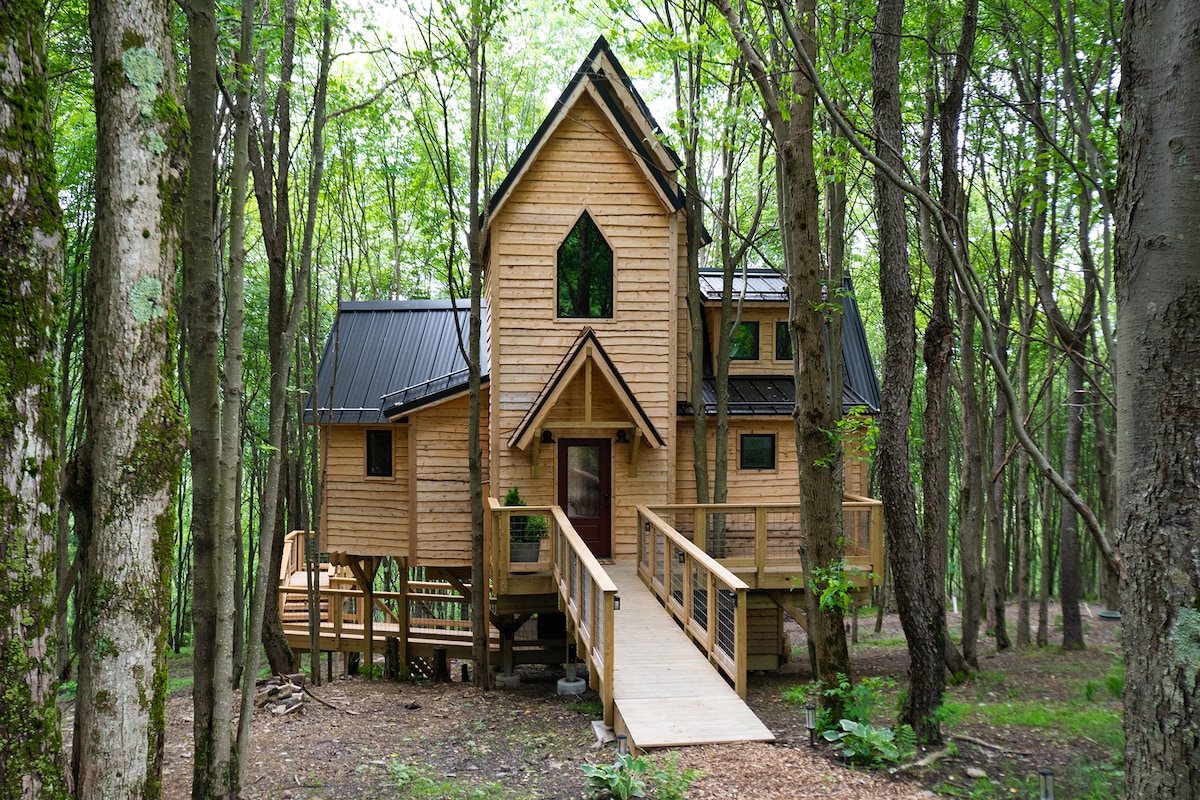 Расположенный высоко среди прочных ветвей, «Вид с высоты птичьего полета» - это святилище, подвешенное между землей и небом. Наш дом на дереве, расположенный менее чем в 5 минутах от озера Дип-Крик и расположенный среди листвы, предлагает панорамный вид на окружающий лес, предоставляя своим посетителям непревзойденную смотровую площадку, чтобы понаблюдать за чудесами природы. Расслабьтесь в гидромассажной ванне и насладитесь удивительным закатом. Дом представляет собой гармоничное сочетание местного искусства и мебели, которое добавляет деревенского очарования и современного комфорта.