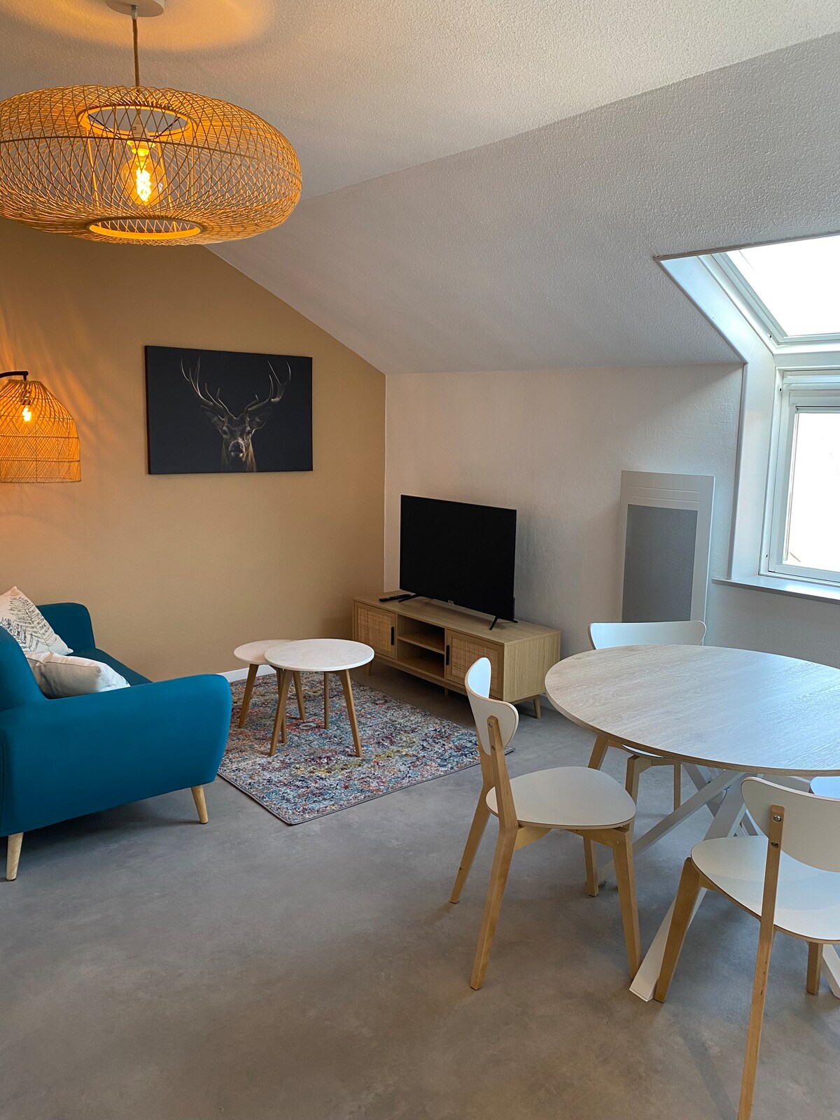 Исследуйте наш дуплекс площадью 65 кв. м, тщательно отремонтированный в 10 минутах ходьбы от центра Ремиремонта. Расслабьтесь в шикарной гостиной с кожаным диваном, телевизором и приставкой Wii. Новая кухня ждет вас в изысканные моменты. Из главной спальни наверху открывается потрясающий вид на горы и город Ремиремон, а стильная вторая спальня с двуспальной кроватью и офисом дополняет пространство. Насладитесь абсолютным спокойствием в конце нашего тупиковой улицы. Курение запрещено, с уличной парковкой.
