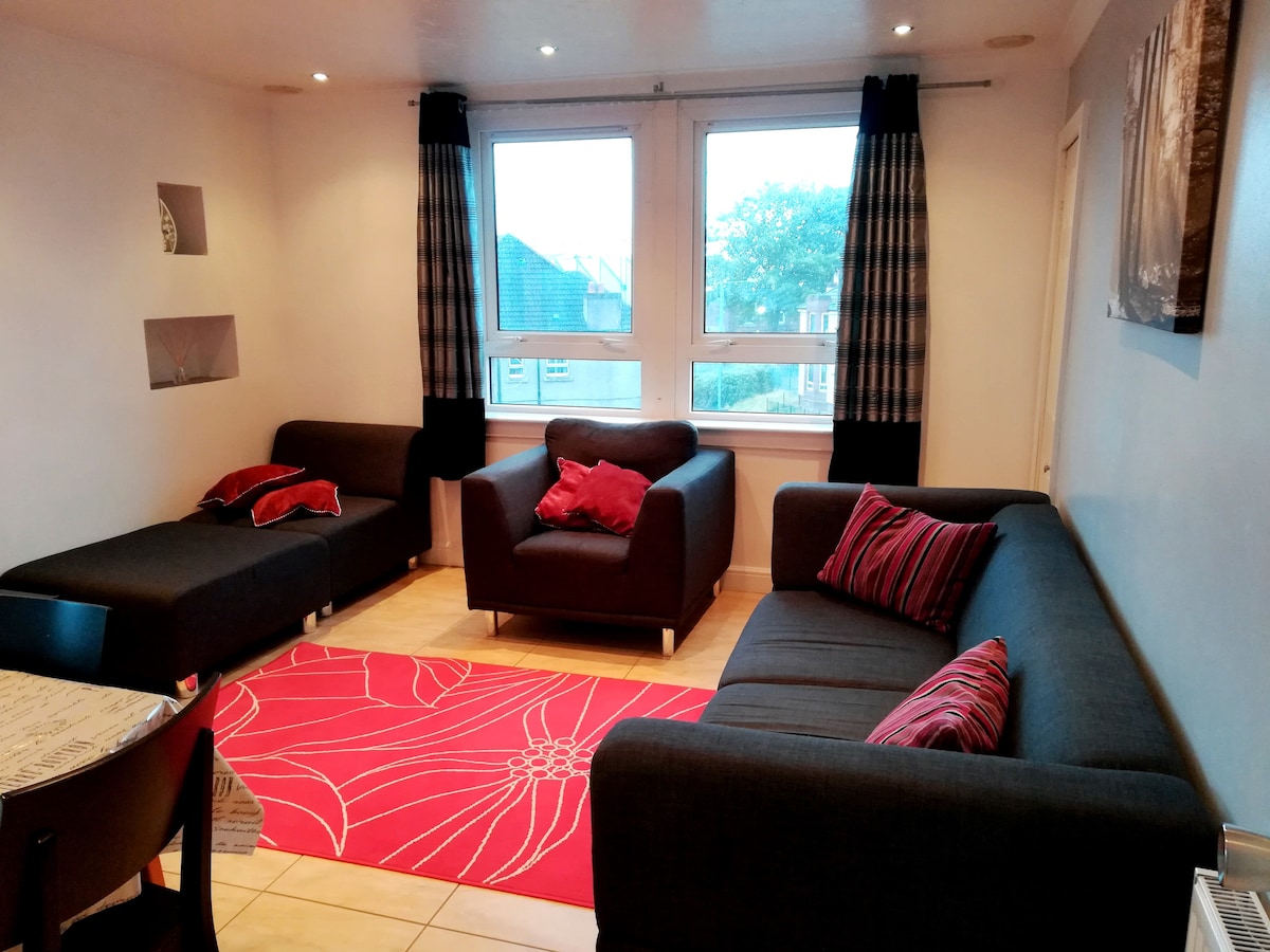 Please inquire before making any reservation - the calendar may not be updated. Twin room in fully equipped and comfy 3 bedroom apartment. There is a Virgin Optic fibre 100 Mbps, Virgin Tv & Netflix. If needed can be added a desk an chair. There is a smart 32" tv in each bedroom and 42" smart tv in the living room. Nest thermostat for heating. The location is close to the Motorway, to Glasgow international airport, retail parks, Paisley & Glasgow.