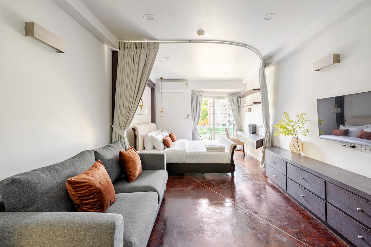 Откройте для себя свой идеальный рай для отдыха или удаленной работы в этой новой квартире-студии площадью 35 кв. м. Насладитесь комфортом двуспальной кровати размера King size, отдыхайте в уютной гостиной с 55-дюймовым смарт-телевизором или наслаждайтесь видом с балкона. Оставайтесь продуктивными, с отличным высокоскоростным Wi-Fi и Gigabit LAN. Кроме того, небольшая отдельная кухня оснащена комбинированной стиральной машиной/сушилкой для дополнительного удобства. Расслабьтесь в 400-метровом бассейне или воспользуйтесь доступом к нашему полностью оборудованному фитнес-центру на территории.