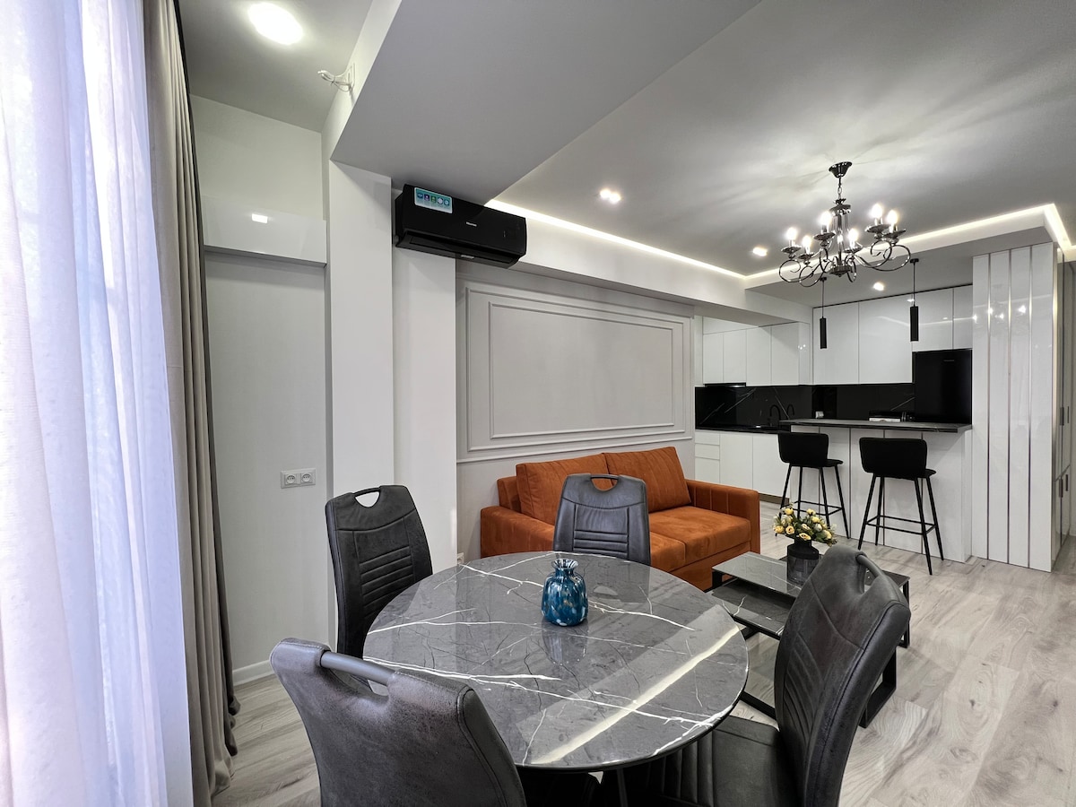 Живите в 2 минутах ходьбы от площади Республики. Luxe на верхнем этаже с 1 спальней и потрясающим панорамным видом. Наслаждайтесь современным интерьером,55-дюймовым телевизором, IPTV, Wi-Fi и современной техникой, включая подогрев пола для круглогодичного комфорта. В нескольких шагах есть супермаркеты, пункт обмена валют, аптека, пиццерия, ночной магазин еды и игр, а также скайбар для ночной жизни. Прямо перед домом есть парк, а эксклюзивный доступ на лифте на два верхних этажа обеспечивает уединение и отсутствие ожидания. Роскошная жизнь с максимальным удобством!