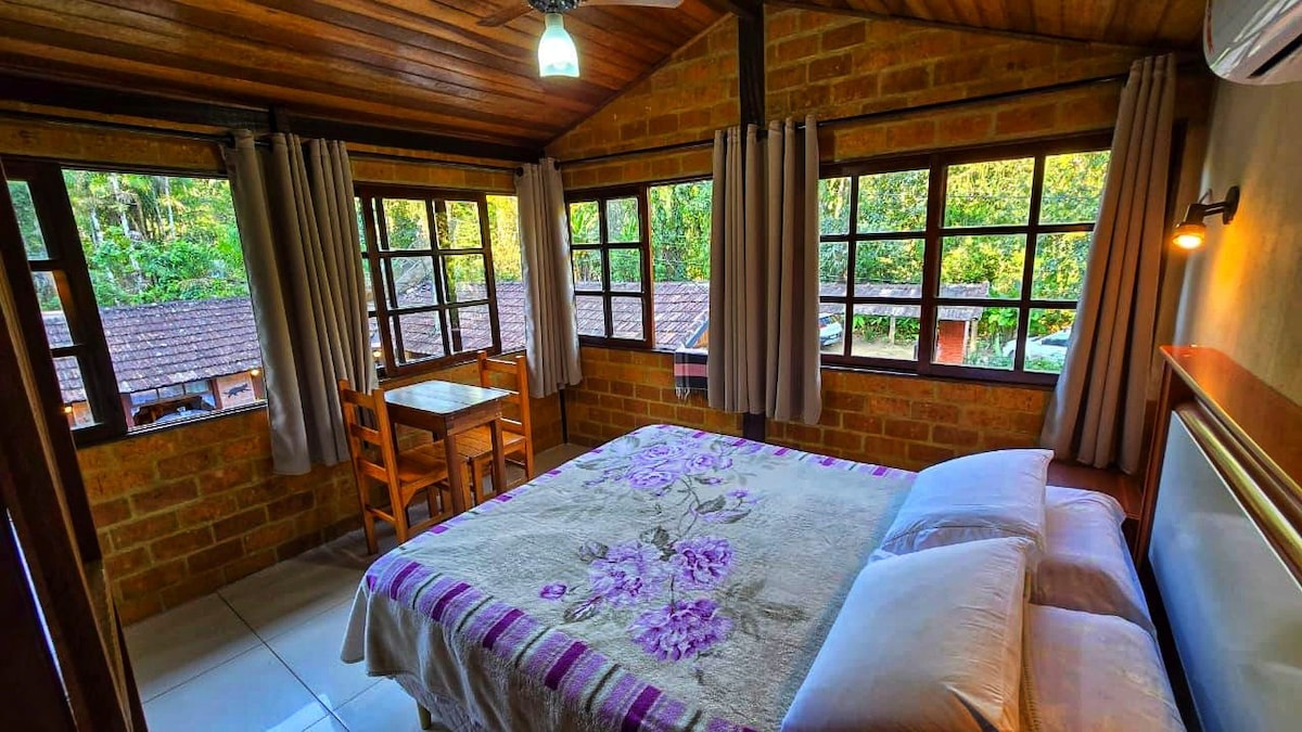 Шале расположено в Visconde de Máua. Это люкс с камином, двуспальной кроватью, компактной кухней с варочной панелью (2 конфорки), мини-баром, двойным столом, сэндвичницей, кухонной утварью, фильтром, ванной комнатой, телевизором, балконом с гамаком. Кроме того, у нас есть другие помещения с барбекю, бассейном, игровым столом, игровыми автоматами, красивыми цветами, горизонтальной сеткой и множеством птиц! Расслабьтесь в этом тихом и стильном месте.