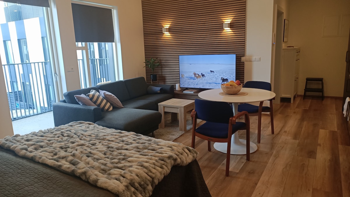 Наша квартира очень уютная, с прекрасным видом на горы. Квартира находится рядом с нашей квартирой, поэтому мы всегда готовы помочь нашим гостям с идеями о том, что делать :) От аэропорта (7 минут ходьбы) до Хамраборга очень легко доехать на автобусе, а также доехать до центра города на электровелосипеде (Hopp) вдоль побережья и доехать до центра города :)