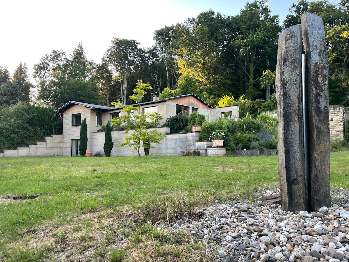 Добро пожаловать в Leinsweiler Lodge | Особое уединение в Южном Пфальце На солнечной окраине леса в Ляйнсвайлере, одной из самых очаровательных винодельческих деревень вдоль Южного винного маршрута, вас ждет эксклюзивный дом для отдыха, полный характера, комфорта и панорамных видов. Построенный в стиле дома A-Frame, дом был с любовью отремонтирован с нуля – с пристальным вниманием к эстетике, качеству и атмосфере, в гармонии с его архитектурой и окружающей природой.