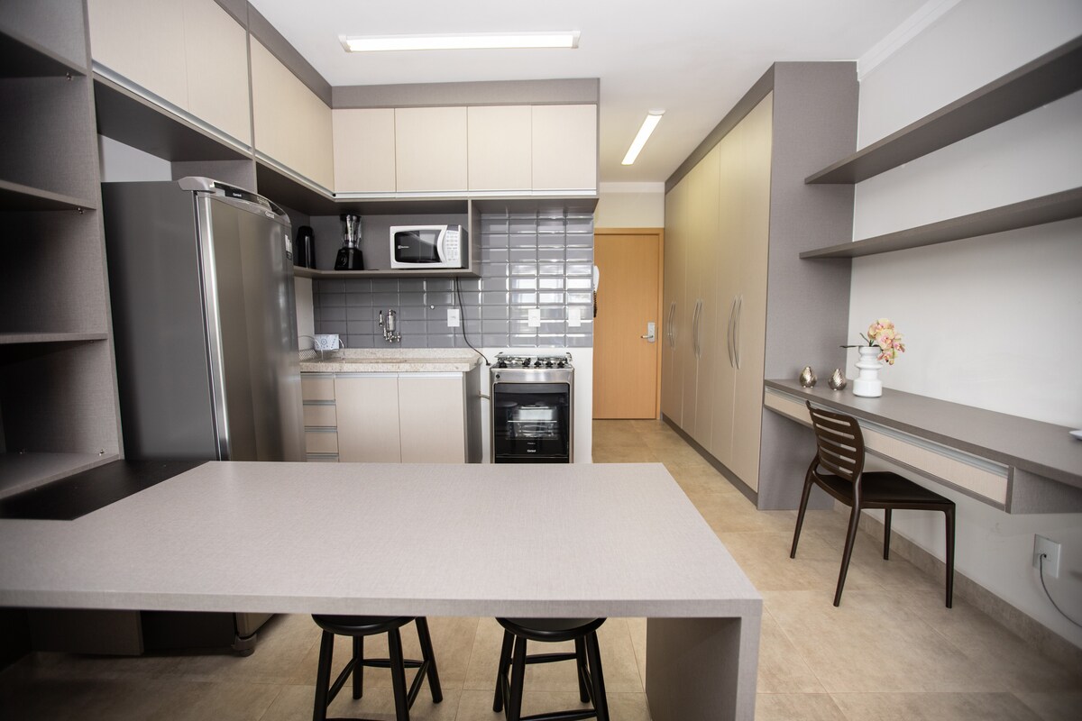 ✨ Seu refúgio de conforto e sofisticação! ✨ Hospede-se neste apartamento luxuoso e completo, perfeito para quem busca comodidade e bem-estar. ✔️ Ambiente moderno: cozinha equipada, sala aconchegante, quarto confortável e banheiro elegante. ✔️ Conectividade e lazer: Wi-Fi grátis, Netflix (use sua conta), piscina aquecida, academia, sauna e salão de jogos. ✔️ Conveniência: mesa para refeições, 1 vaga coberta e roupas de cama e banho. ✔️ Check in rápido